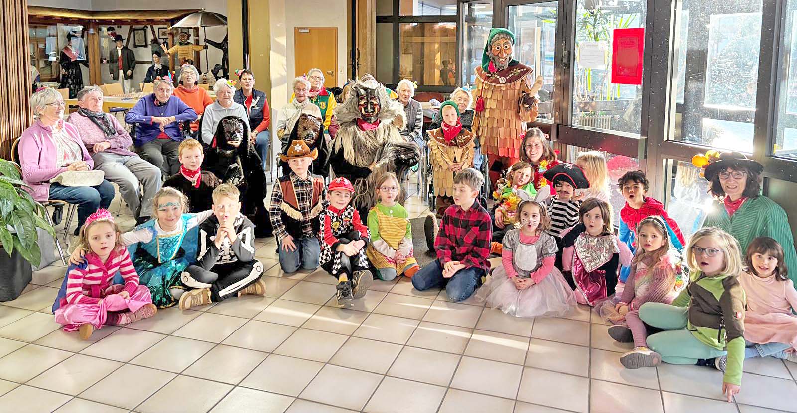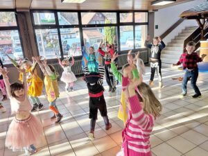 Währenddessen hielten die Kinder draußen bereits gespannt Ausschau nach weiteren närrischen Gästen – und wurden nicht enttäuscht: Zu schwungvoller Musik zogen ein Steinteufel, zwei Schindelmocher und drei Bären ins Foyer ein. Nach einer gemeinsamen Polonaise durfte auch beim „Rucki Zucki“ niemand sitzen bleiben.