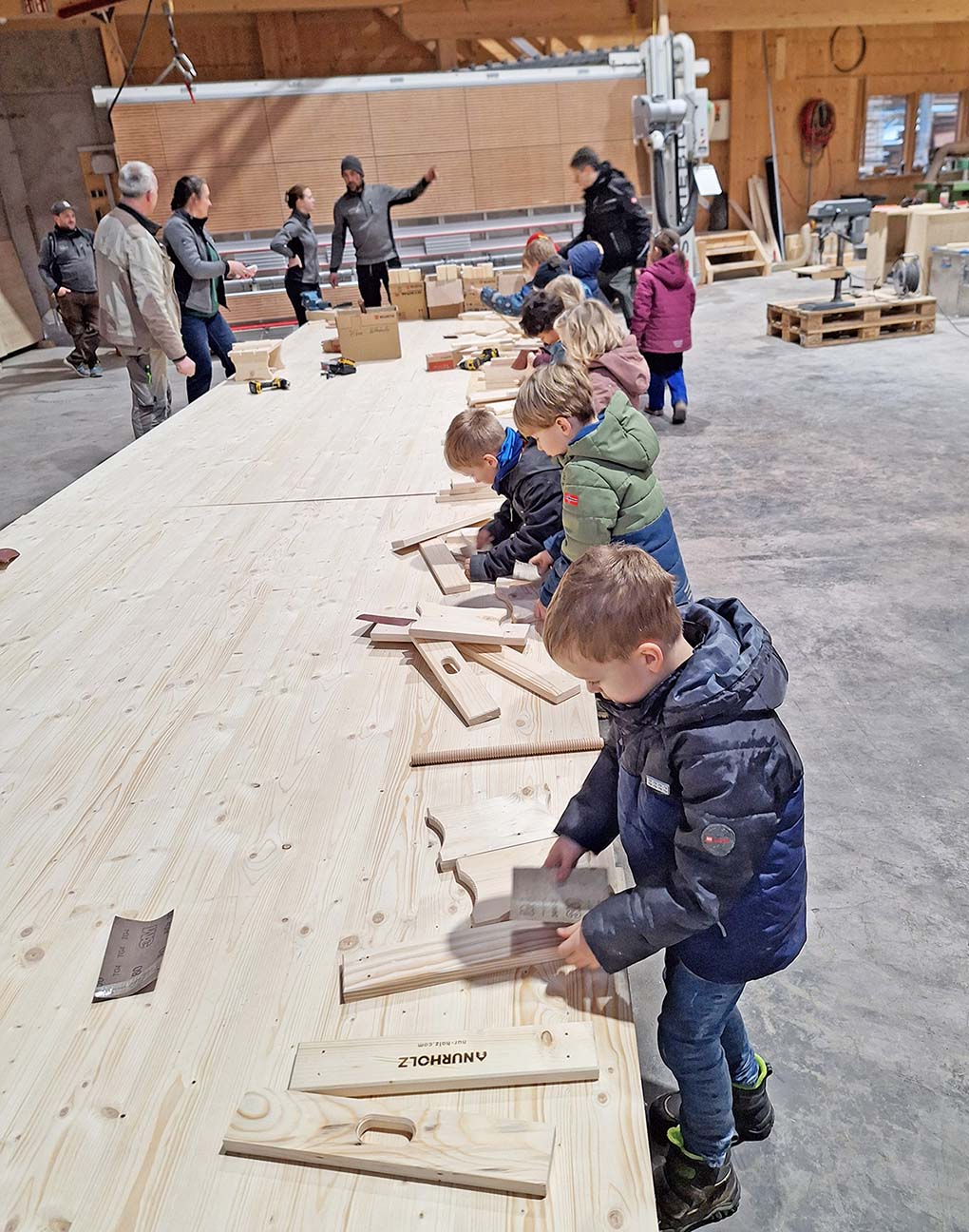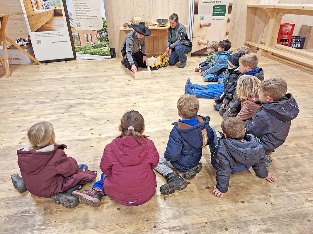Herzlich empfangen wurden die Kinder von Tanja Rombach und Matthias Kuderer, die die jungen Besucher altersgerecht in die Welt des Handwerks einführten. Gleich zu Beginn erklärte Matthias Kuderer anschaulich, woran man einen Zimmermann erkennt. Anhand seiner typischen Kleidung lernten die Kinder, warum die Zimmermannshose unten weit geschnitten ist, wozu der breitkrempige Hut dient und welche Werkzeuge – wie Hammer, Meterstab und Bleistift – immer griffbereit sein müssen.