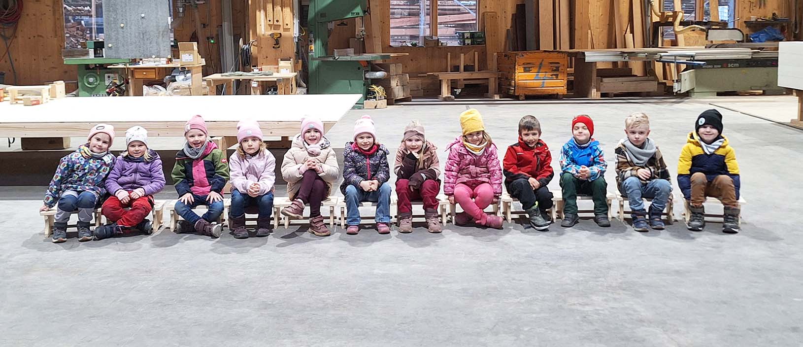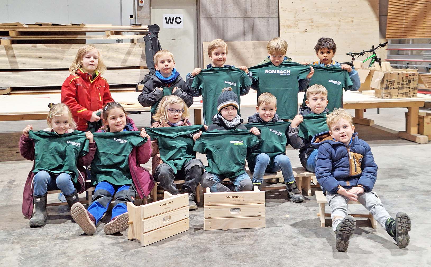 Foto: Kinderhaus SonnenblumeIm Rahmen des Kita-Wettbewerbs des Handwerks „Kleine Hände, große Zukunft“ besuchten die Schulfüchse des Kinderhauses Sonnenblume die Firma Rombach in Oberharmersbach und erhielten dabei spannende Einblicke in den Beruf des Zimmermanns und den modernen Holzbau.