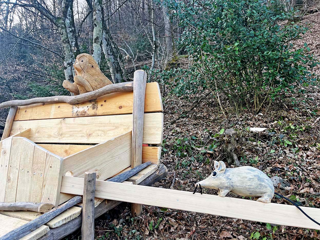 Mit Blick darauf, Synergieeffekte zu erzielen, ist die Bahn ab sofort nicht nur für die Kindergartenkindern eine zusätzliche Spielmöglichkeit. Sie ist auch so platziert, dass sie für alle Kids auf dem Natur-Erlebnispfad nochmal richtig Aufwind in das letzte Stückchen Fußweg bringt. Und zwar im wahrsten Sinne des Wortes, denn hier kann man die Kugel nicht nur flitzen lassen, sondern auch in die Luft befördern, wo sie vom Igel aufgefangen, von der Maus durchgelassen und vom Vogel in Empfang genommen wird.