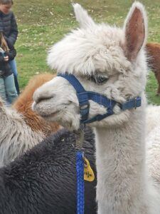 Im hausnahen Gehege trafen zehn wuschelige Alpakas an. Herr Neumayer stellte seine Tiere vor und erklärte den Kindern, wie man mit den Tieren umgehen soll. Seine sanfte, liebevolle Art lässt die Tiere Zutrauen zu den Menschen fassen und es ist kein Problem sie am Halfter zu führen. Die leise ruhige Art der Tiere lässt auch die lautesten Jungs still werden. Alle Tiere tragen Schildchen mit Namen und Geburtstag um ihren Hals, sodass man sie beim Namen nennen kann.