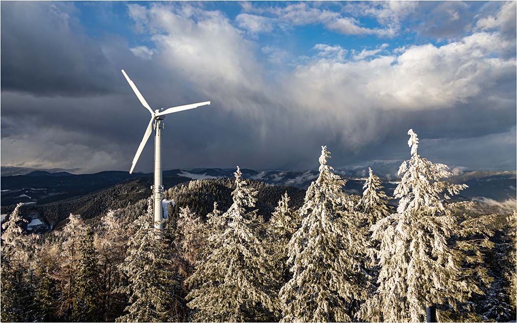 Von oben öffnet sich der Blick ins Dorf Oberharmersbach. Zwischen Wolken und Licht zeigt sich eine besondere Stimmung. In der Ferne liegt das Geroldseck im Strahlenkranz der Sonne, während nach Norden hin die Landschaft unter wechselndem Wetter steht. Auch das ehemalige Jalbo-Windrad taucht im winterlichen Panorama auf.