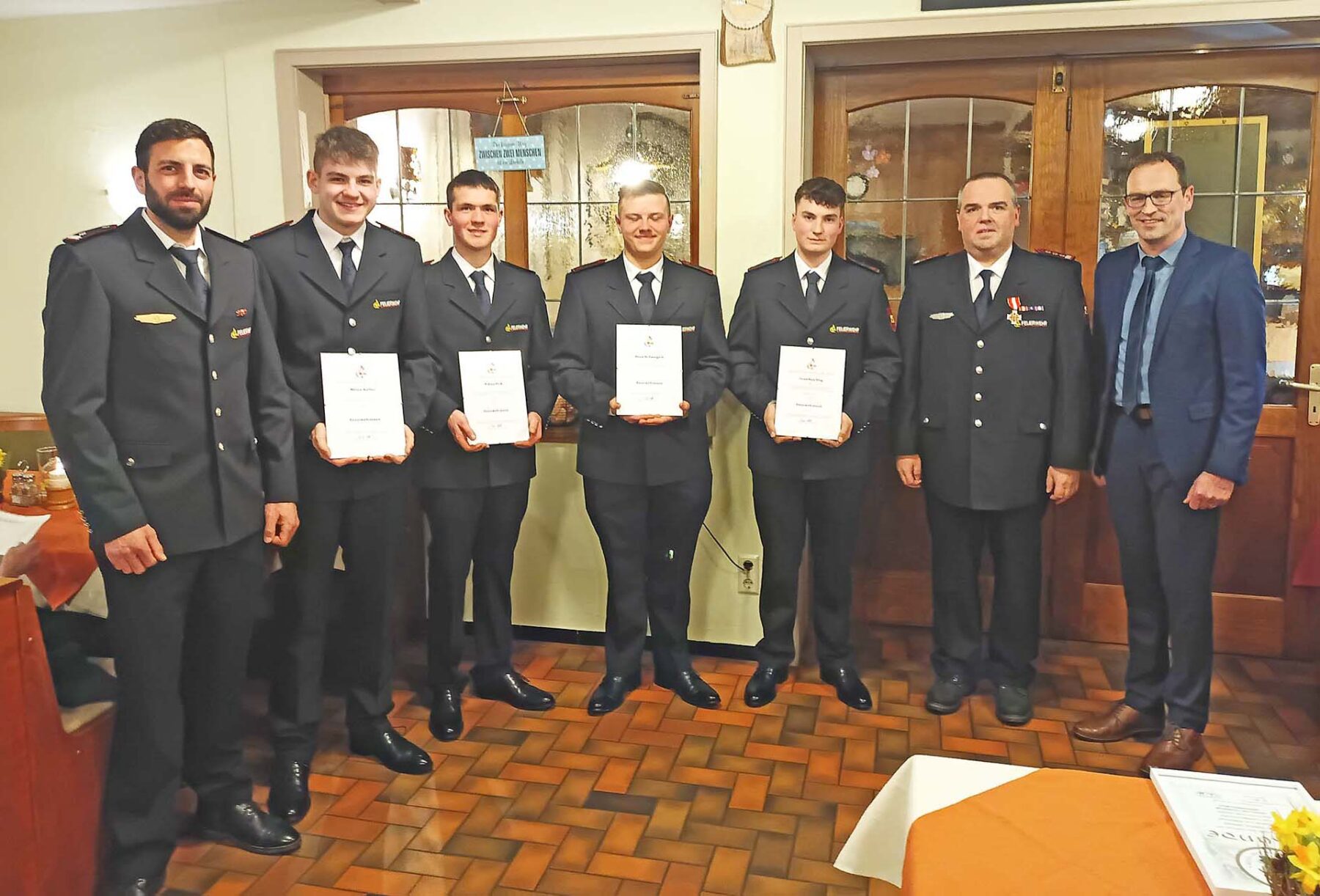 Auch Beförderungen standen auf der Tagesordnung: Mirko Keller, Jonathan Hug, Niklas Birk und Sven Schweigert wurden vom Feuerwehranwärter zum Feuerwehrmann ernannt. Während Ralf Liebke und Samuel Vollmer vom Feuerwehrmann zum Oberfeuerwehrmann befördert wurden.
