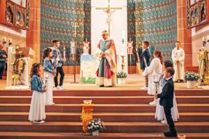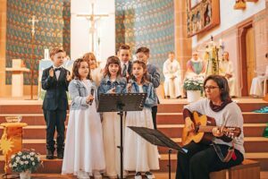 Der durch das Erstkommunionteam zusammen mit den Kindern gestaltete Gottesdienst war festlich und zugleich lebendig. Die Kommunionkinder brachten sich ein und übernahmen selbst die Begrüßung der Kirchengemeinde, trugen Gebete und die Fürbitten vor und gemeinsam mit Nicole Lehmann sangen sie das zum Motto gleichnamige Kommunionlied.
