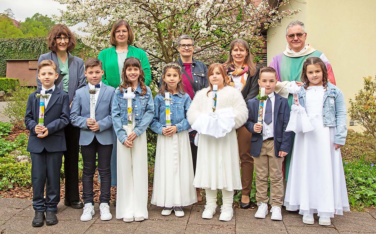 Auch das Wetter passte sich dem diesjährigen Kommunionmotto „Wir sind Sonnenstrahlen Gottes“ an. So konnten die vier Mädchen und drei Jungen ohne Regen, sogar mit etwas Sonnenschein, in Begleitung der Miliz- und Trachtenkapelle Oberharmersbach, den Ministranten, Pfarrer Bonaventura Gerner und dem Erstkommunion-Team in die festlich geschmückte Kirche einziehen.