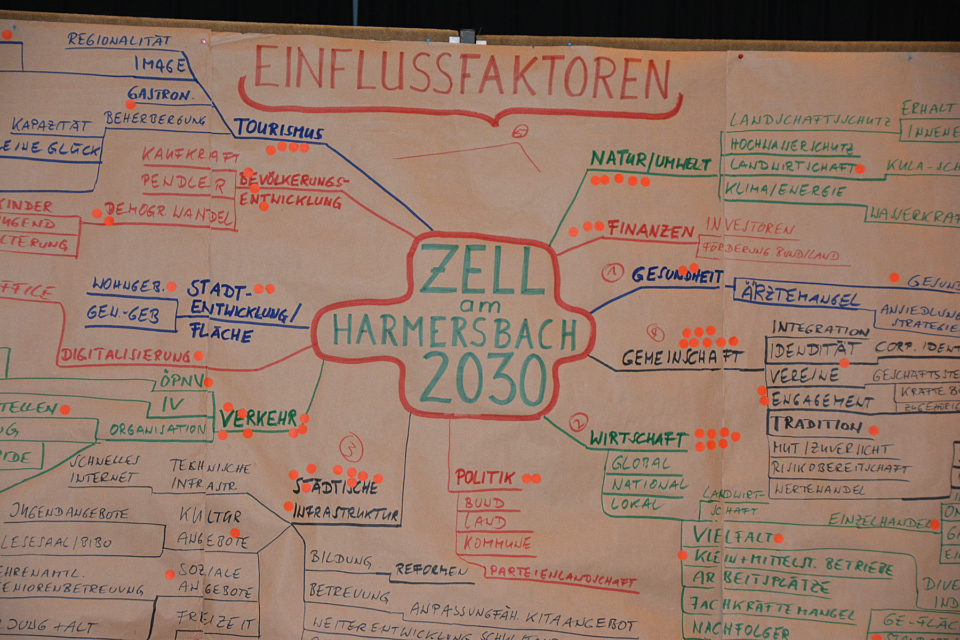 »An welchen Stellschrauben kann man drehen?«, forderte Professor Dehne die Teilnehmer dazu auf, darüber nachzudenken, welche Schwerpunkte sich daraus für Zell ergeben. Dabei wurden eine Fülle von Ideen auf die große Plakatwand notiert. Ein Augenmerk wurde auf den Erhalt und die Schaffung von Arbeitsplätzen gelegt. Für den Zeller Einzelhandel könnte sich der Vertrieb über das Internet als »Ama-Zell« oder »Zell-lando« entwickeln. Beim Tourismus oder als Gesundheitsstadt könnte Zell vor allem mit seiner Natur punkten. Unter dem Motto »Das kleine Glück« könnten Gastgeber ein einheitliches Zimmer- und Speiseangebot mit regionalen Produkten vermarkten. Die Schaffung eines Senioren- und Jugendzentrums oder der Ausbau von Zell als Sportstadt wurde genannt. In der Vereinswelt könnte mit einer Geschäftsstelle die übergreifende Zusammenarbeit neu formiert werden.