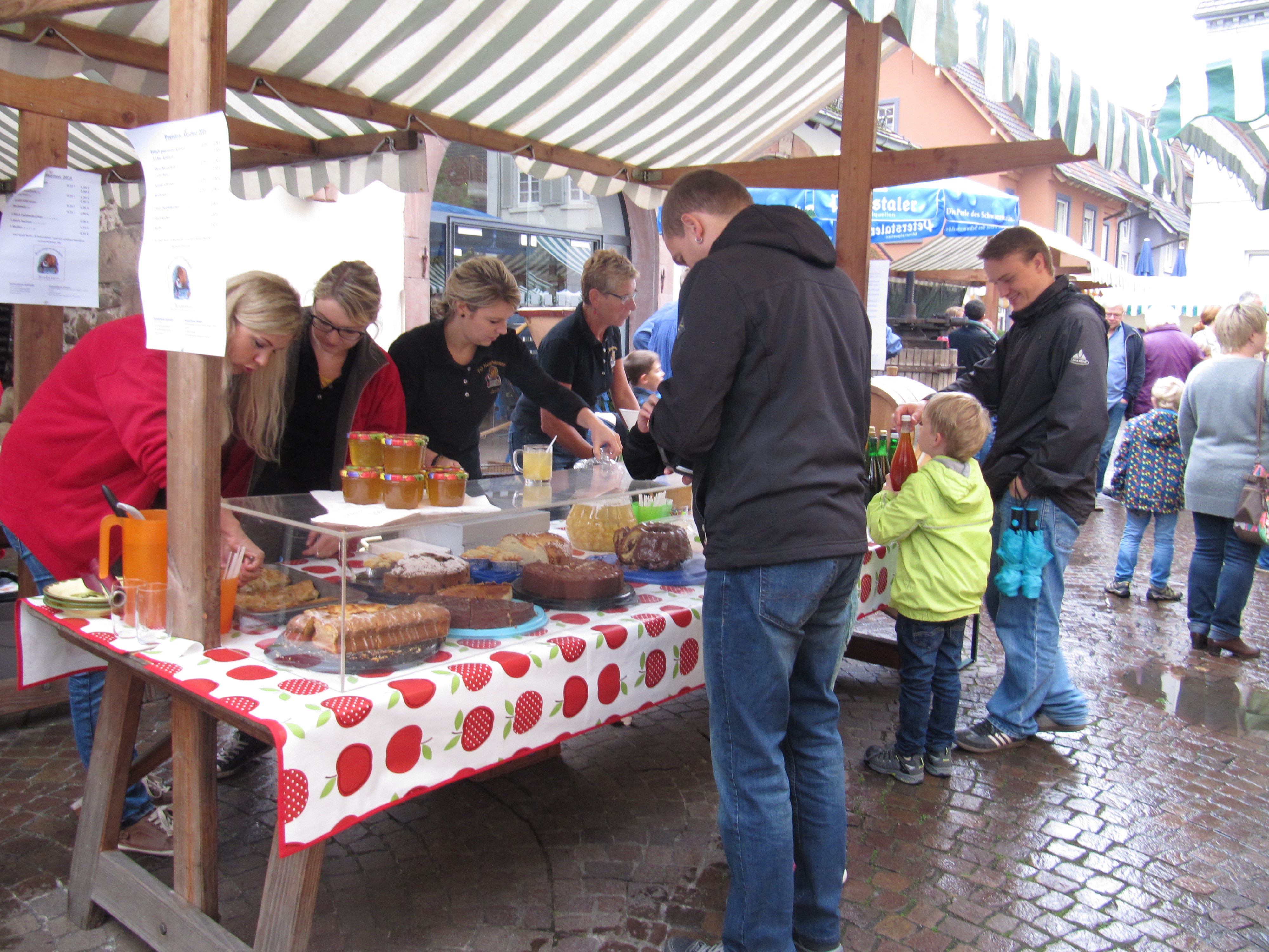Die Maidle schenkten indessen den Marktbesuchern den frisch gepressten Saft aus. Wer wollte, bekam auch den behutsam vergorenen Most. So richtig durstig waren allerdings nicht viele Kunden. Das Wetter hatte doch im Vergleich zu den letzten Wochen merklich abgekühlt. Der Himmel war bewölkt und ließ ab und zu ein paar Tropfen fallen. Für die staubtrockene Natur war es zu wenig, für den Marktbetrieb war es ok.