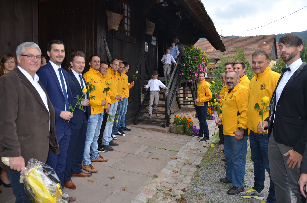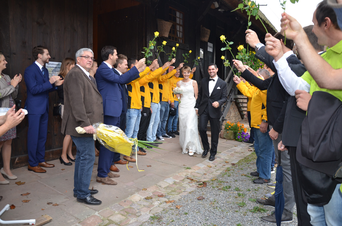 Über diesen wunderbaren Entschluss freuten sich mit ihnen auch die Fußballer des ZFV. Seit Kindertagen spielt Michael Harter für die Teams aus dem Badwald-Stadion. Nach vielen Jahren in der ersten Mannschaft wechselte er zuletzt in die Alt-Herren-Mannschaft. Für ihren Teamkollegen und seine Angetraute formten die ZFVler mit gelben Rosen ein Dach und wünschten Uli und Hardy für die gemeinsame Zukunft alles Gute. Daran an schlossen sich die Mitglieder der Fasendgemeinschaft Bruch. Für die zwei waschechten Fasendsnarren hatten sie zum Stell-Dich-Ein im Eheglück je einen original Schwarzwald-Tequila dabei.
