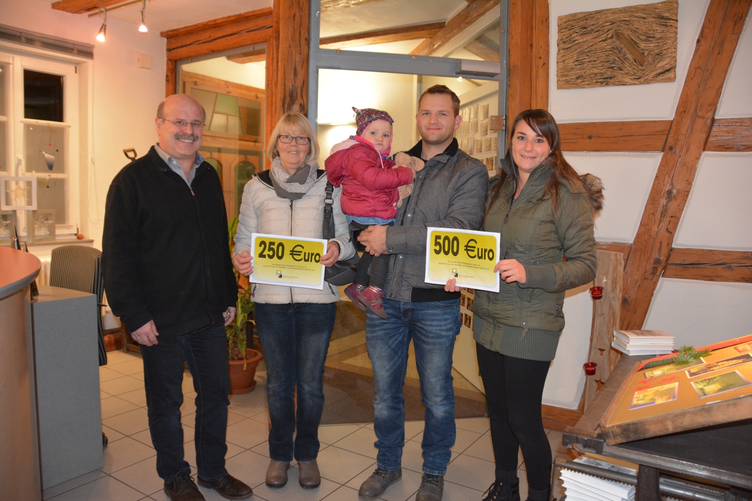 Die Hauptgewinner der Nikolausmarkt-Tombola 2016 stehen fest. Bei der beliebten Tombola haben Pirmin und Melanie Isenmann aus Zell a. H. (rechts) den Hauptpreis im Wert von 500 Euro gewonnen. Gemeinsam mit Töchterchen Lara darf sich die junge Familie jetzt noch zusätzliche Weihnachtswünsche erfüllen.