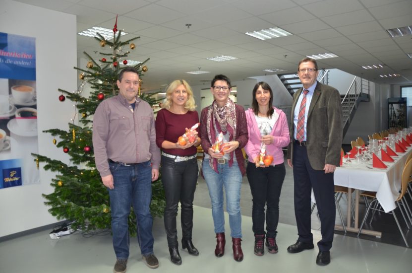 Die Leiterinnen der Kindergartenhäuser (von links) Ingrid Mattheiß, Michele Körnle und Manuela Rizner-Kühnel waren am frühen Nikolaustag ins Werk gekommen, um den Prototyp-Nikolaus für die Kinder »offiziell« abzuholen. Bereits am Vorabend wurden die Zutaten direkt in die Kindergärten geliefert und die Socken und Säckchen der Kinder damit befüllt. Beim kurzen persönlichen Treffen konnten die Leiterinnen von der vorweihnachtlichen Stimmung in ihren Häusern erzählen und bedankten sich damit herzlich bei Geschäftsführer Karl F. Lehmann (rechts) und dem Vorsitzenden des Betriebsrats, Michael Wylegalla (links).