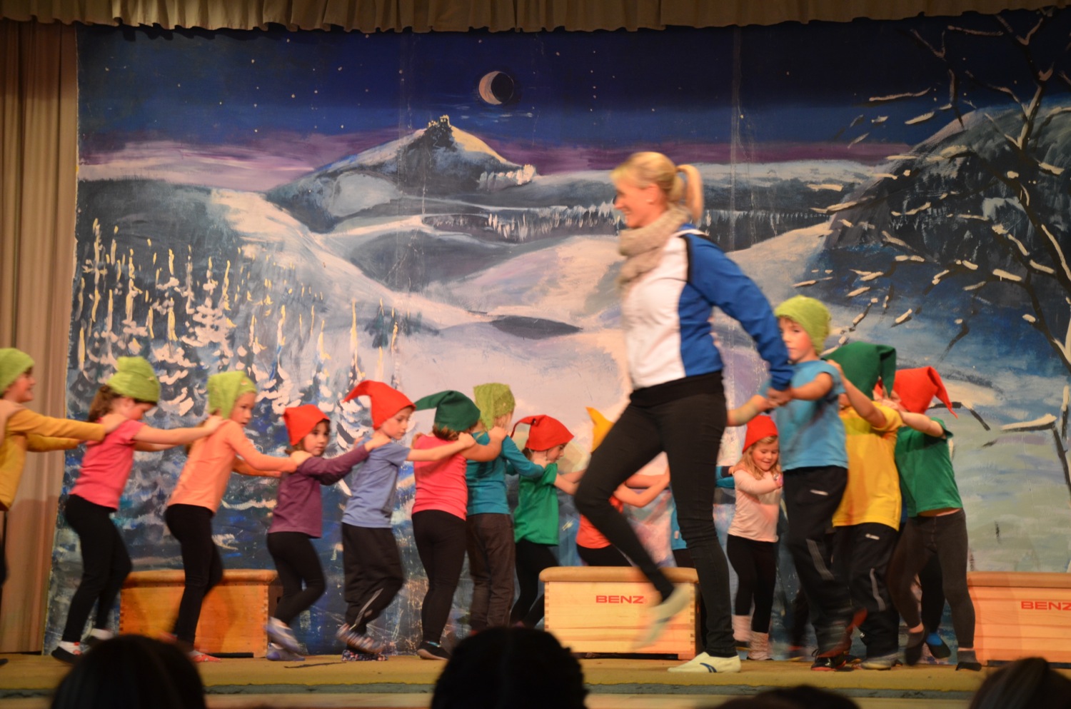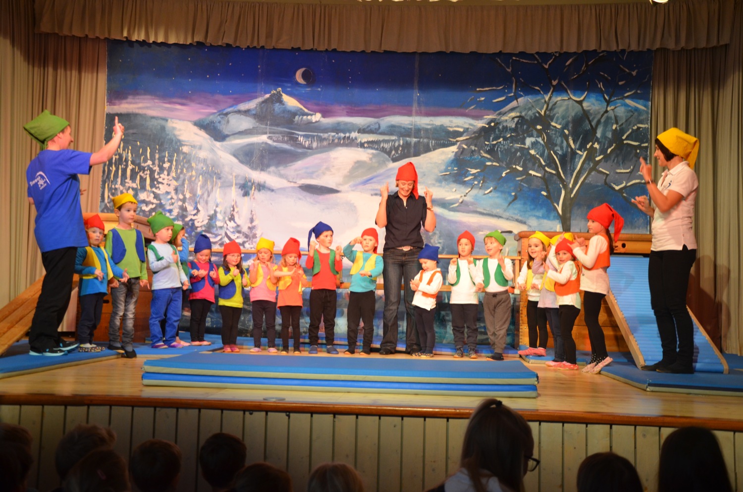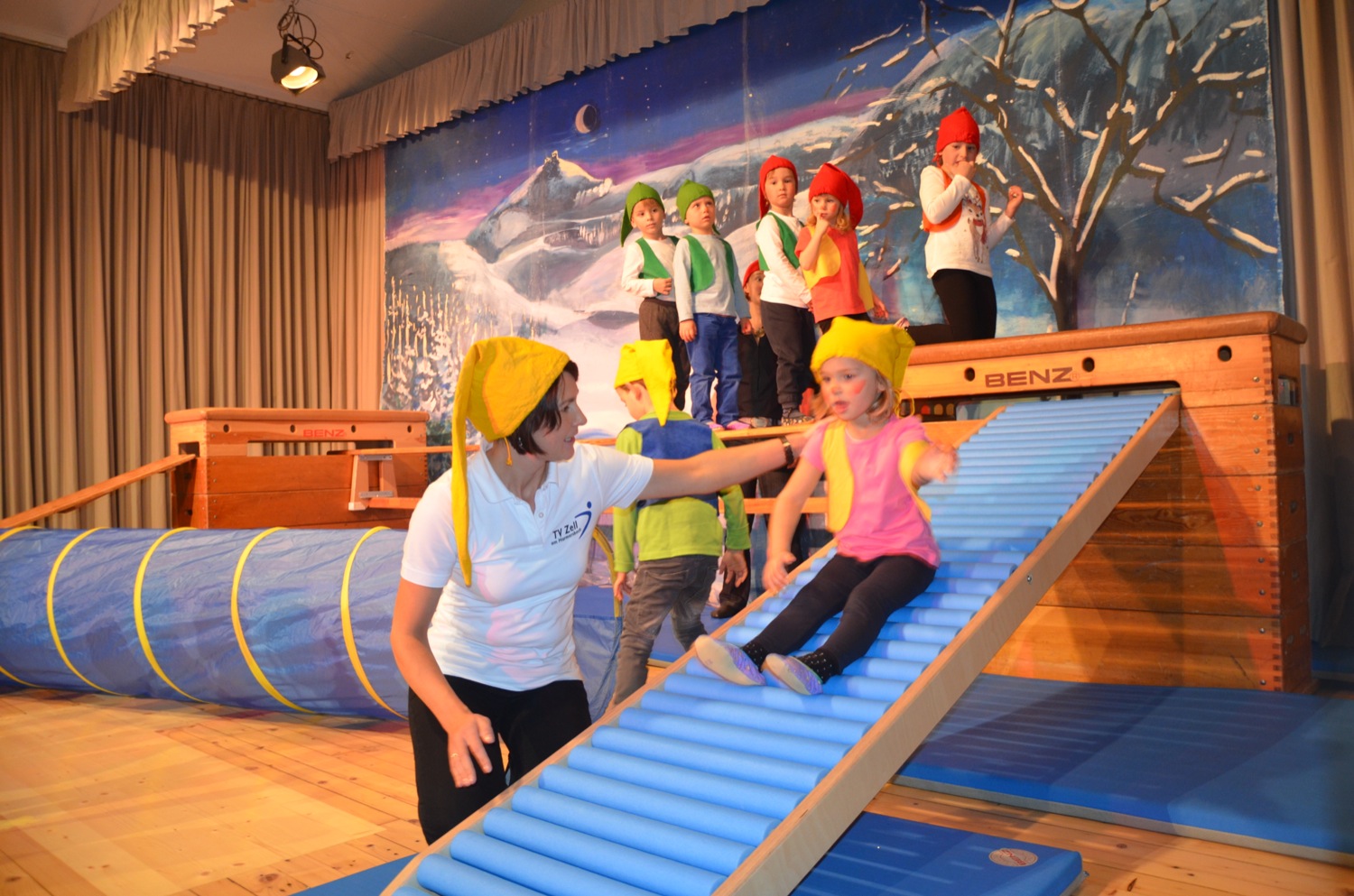 Der Nachwuchs beim TV Zell zählt 310 Turnschüler zwischen null und 18 Jahren. In 14 verschiedenen Sportstunden werden diese von 28 Übungsleitern trainiert. Klein beginnen die Jüngsten: Spielerisch tasten sie sich an Sportgeräte heran und trainieren mutiges und sicheres Bewegen in Gerätelandschaften. Übungsleiterin Claudia Sapparth und das TV-Geräte-Kommando stellten am Sonntag Hängebrücke, Rutschbahn und schiefe Kletterebene auf der Bühne zusammen. Die Kleinkinder zeigten, als Zwerge verkleidet, wie gut ihnen diese Übung schon gelingt und ihre Freude dabei war einfach ansteckend.