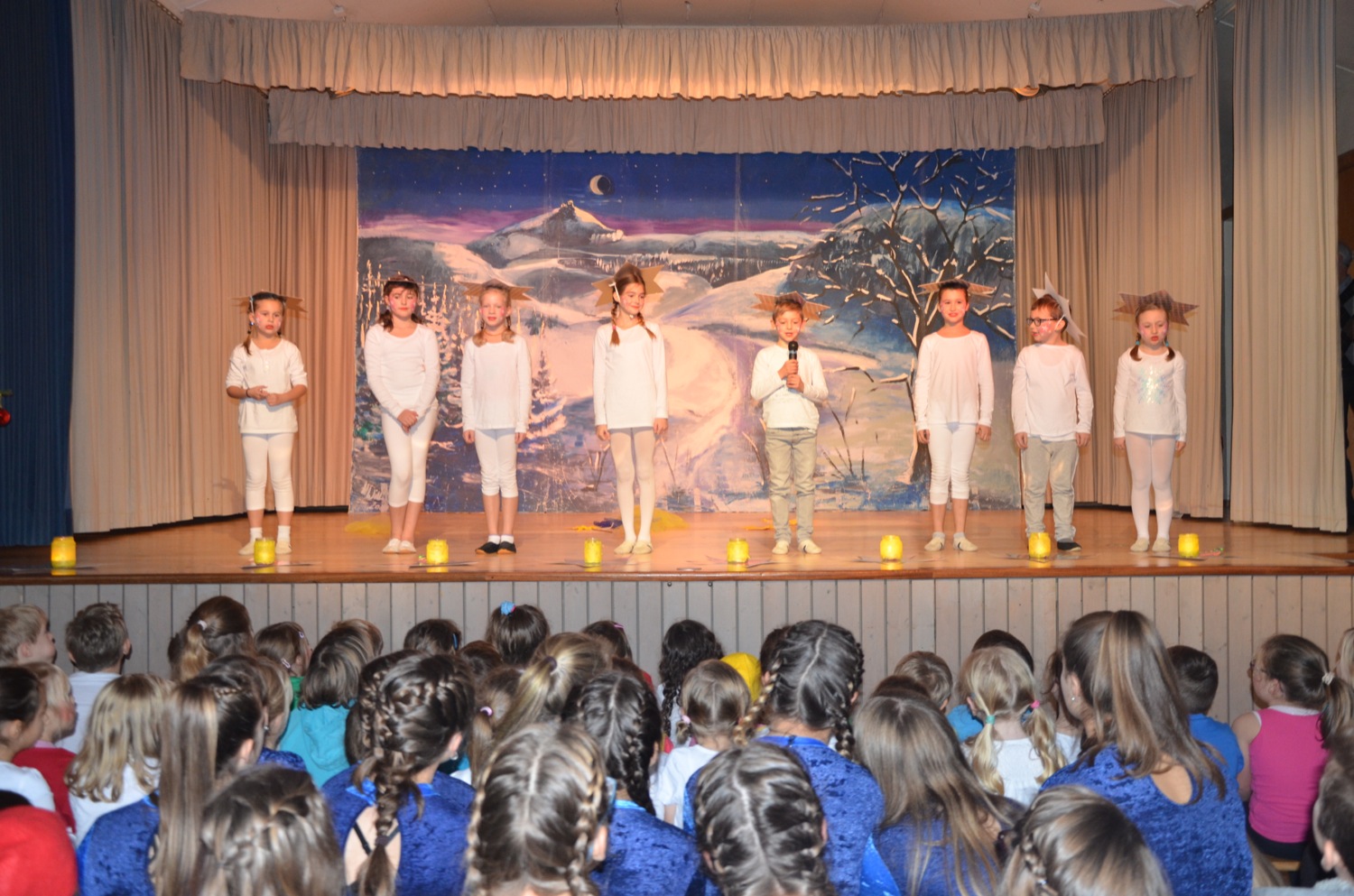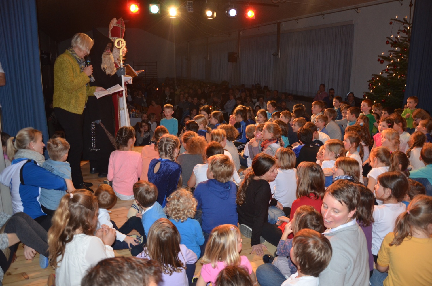 Foto: Ute BergerDie Jahnturnhalle zeigte sich in Weihnachtsstimmung. Lilos Frauen-Turngruppe hatte am Vormittag die Tische dekoriert. Neben der Bühne strahlte ein prächtiger Christbaum aus dem Stadtwald. Es duftete nach frisch gebackenen Waffeln und während die Kinder ihrem Auftritt entgegen fieberten, ließen sich die erwachsenen Gäste vom TV-Team verwöhnen.