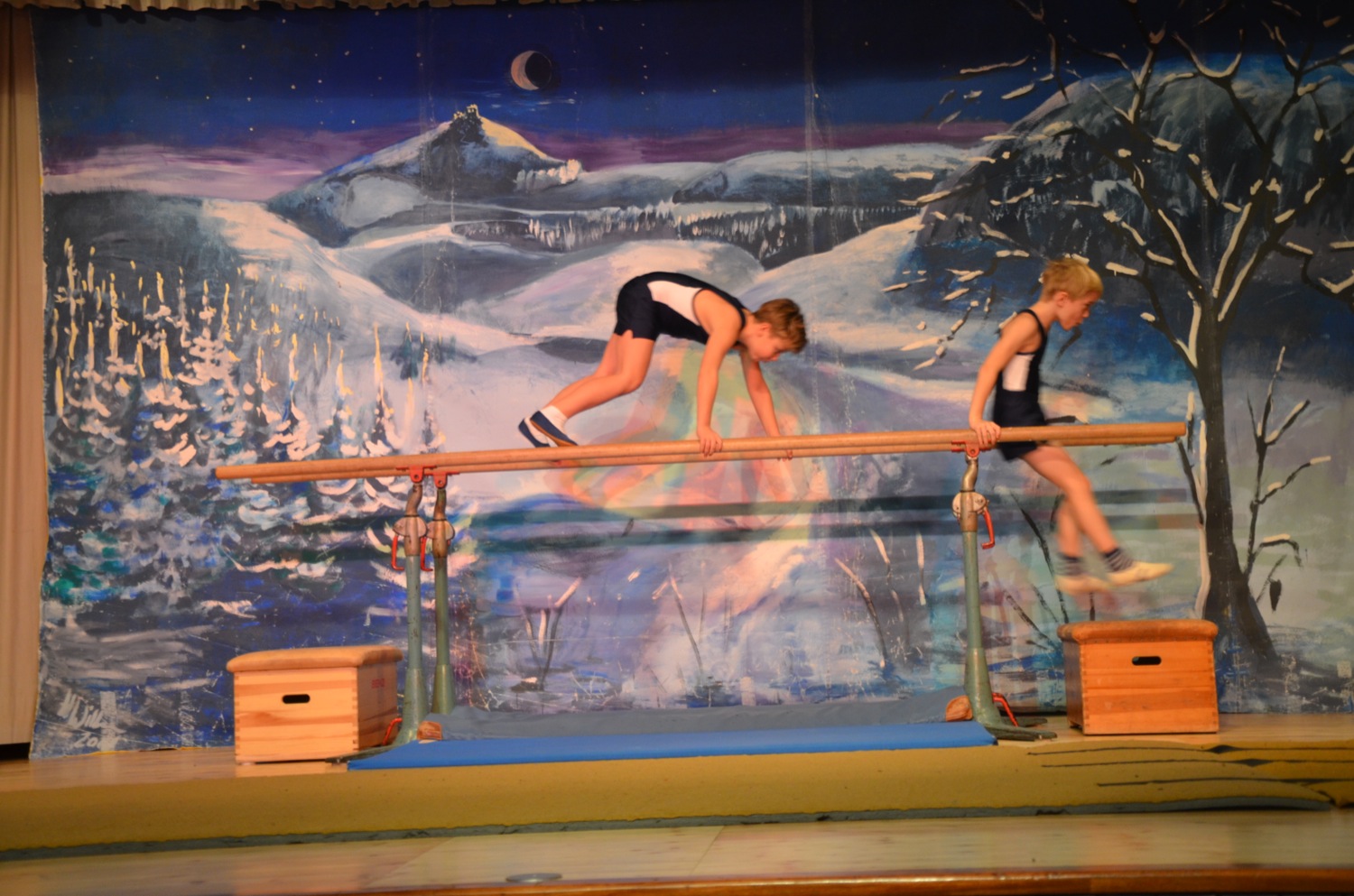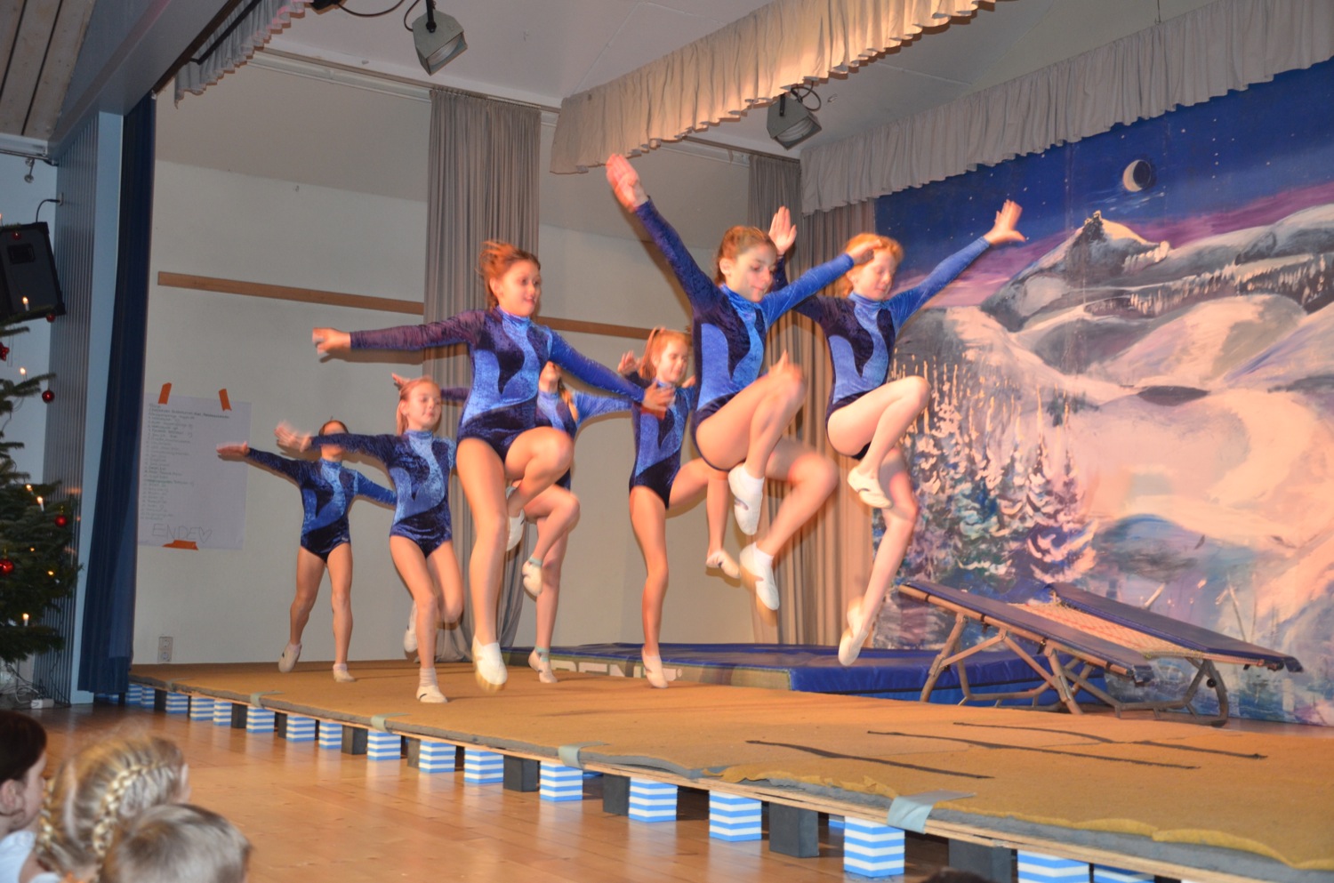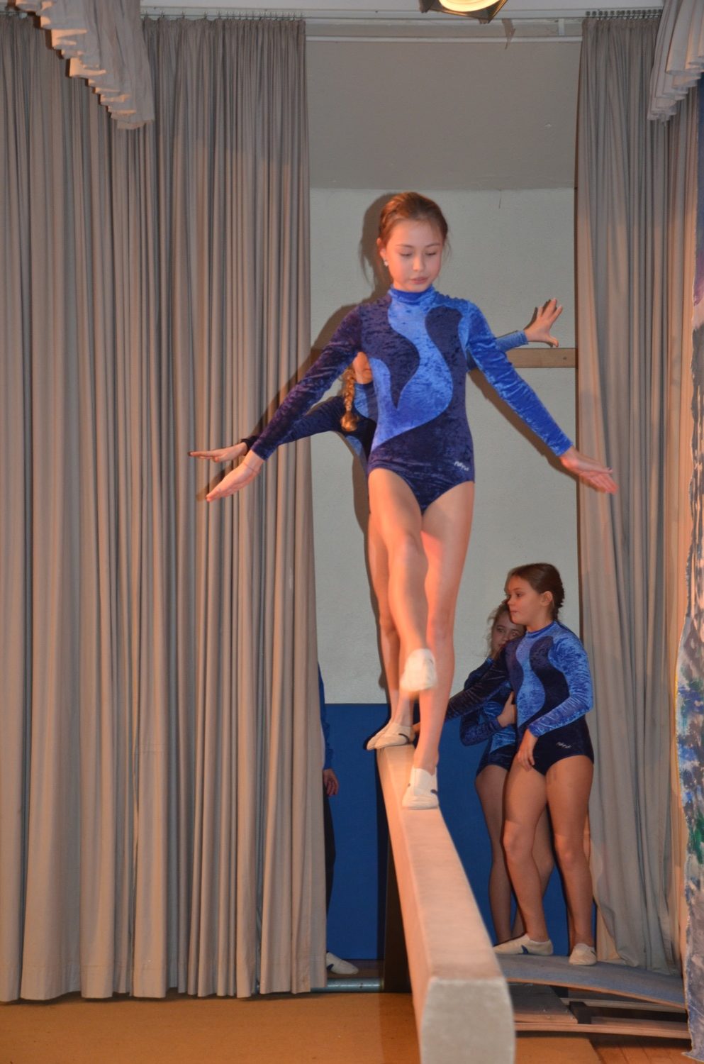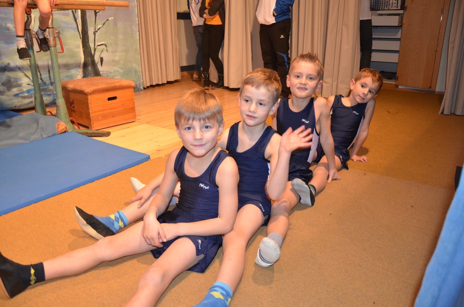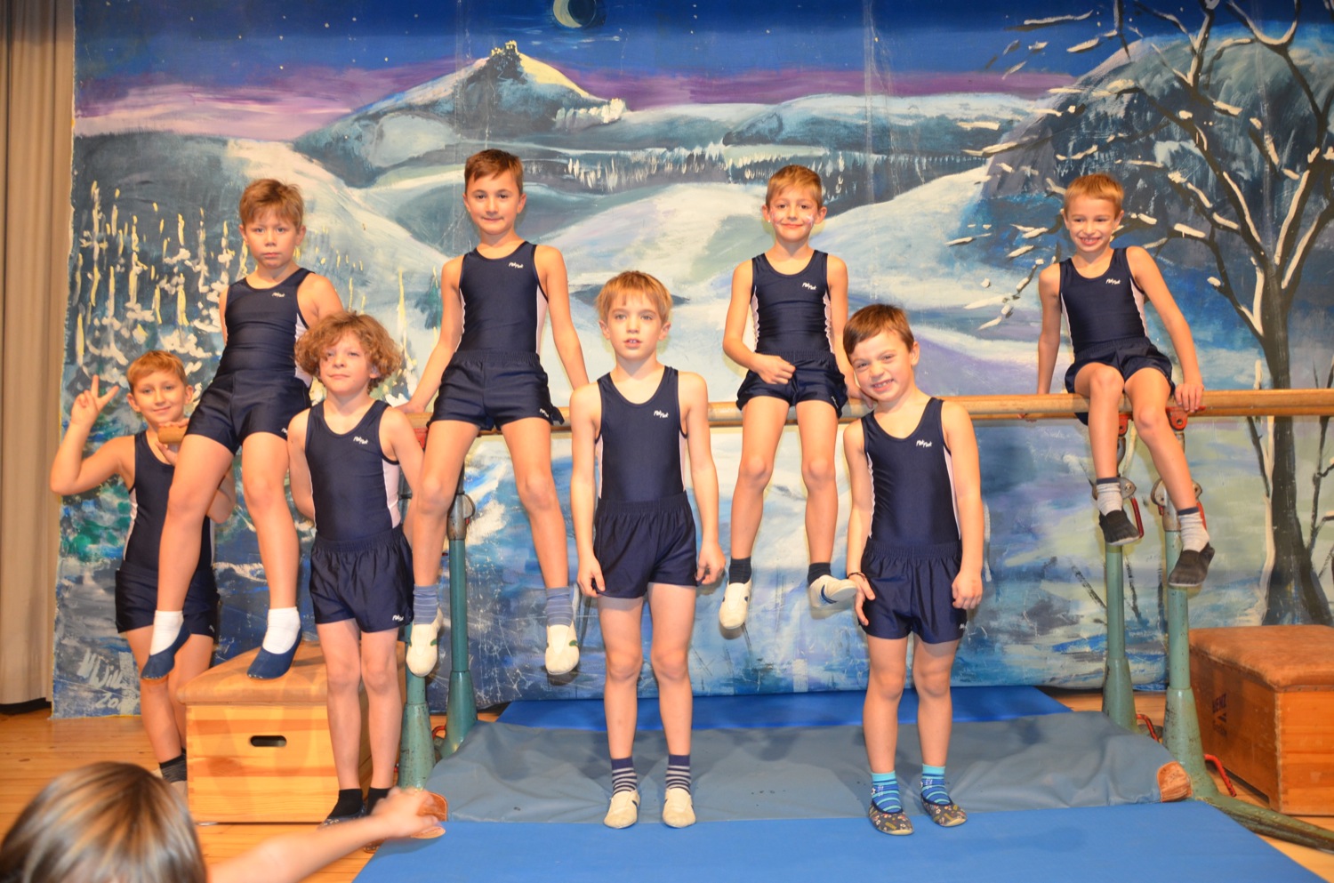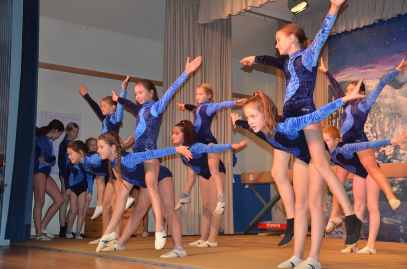 Die Turnklassen eins bis vier, die von fast 150 Turnschülerinnen und -schülern besucht werden, waren die nächsten Akteure auf der TV-Bühne. Jungen wie Mädchen zeigten an Bodenmatte, Balken oder am Barren Turnelemente, mit denen sie im abgelaufenen Jahr bei Wettkämpfen angetreten waren. Dazwischen hatten sie mit ihren Übungsleitern tänzerische, akrobatische und Clowns-Einlagen – sehr zur Unterhaltung des Publikums – parat.
