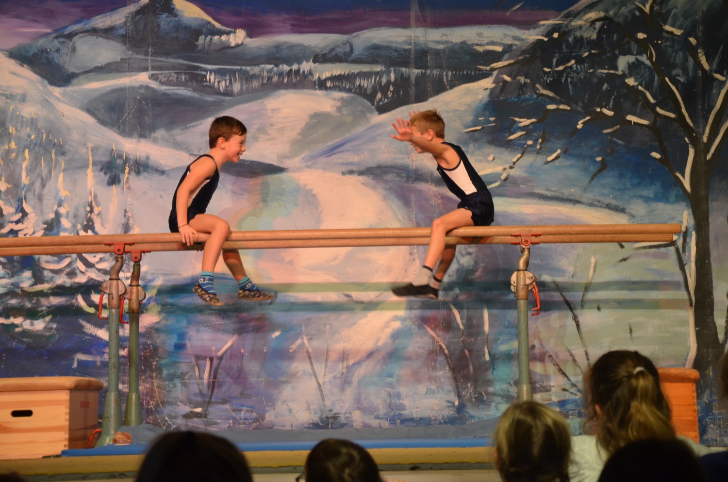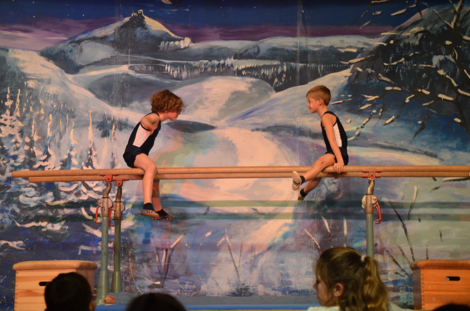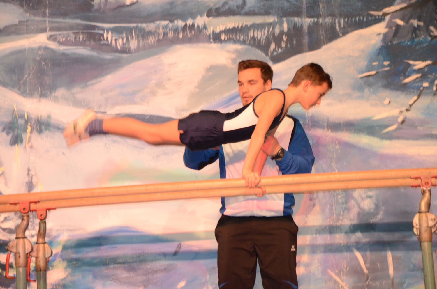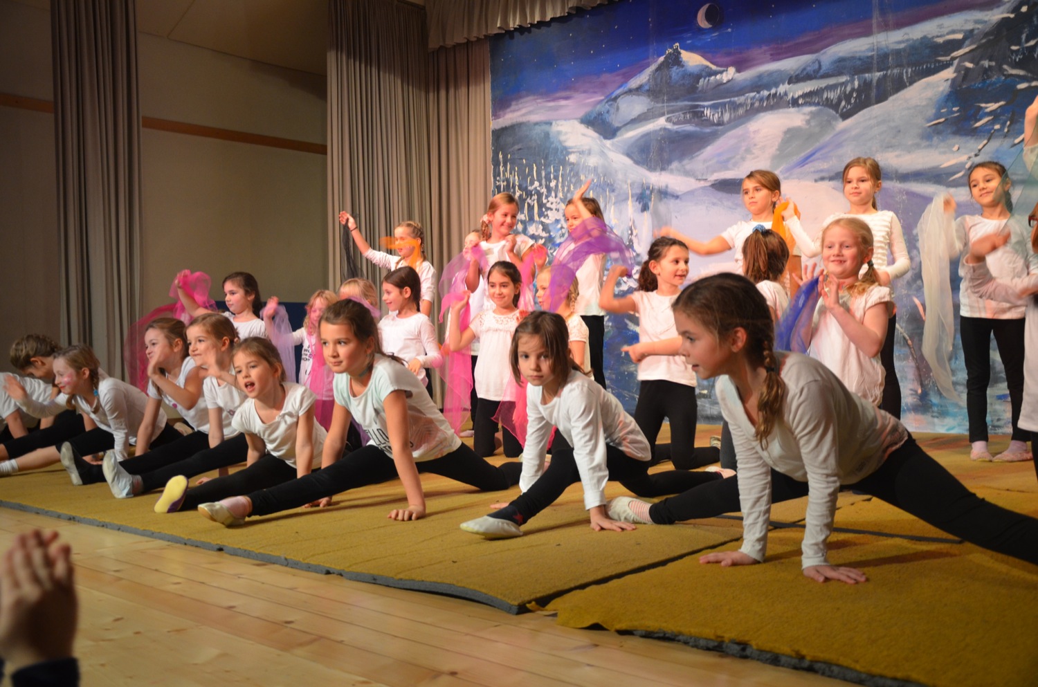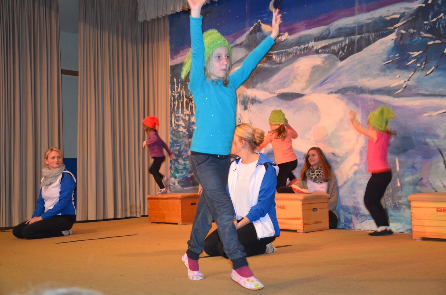 Die Turnklassen eins bis vier, die von fast 150 Turnschülerinnen und -schülern besucht werden, waren die nächsten Akteure auf der TV-Bühne. Jungen wie Mädchen zeigten an Bodenmatte, Balken oder am Barren Turnelemente, mit denen sie im abgelaufenen Jahr bei Wettkämpfen angetreten waren. Dazwischen hatten sie mit ihren Übungsleitern tänzerische, akrobatische und Clowns-Einlagen – sehr zur Unterhaltung des Publikums – parat.