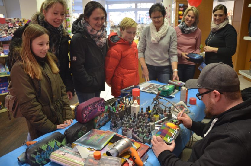 Vergangenen Donnerstag war »Sprayer-Day« in Zell a. H. beim Schulranzenprofi »Schmid – Ideen & Geschenke«. Oliver Traschütz, ganz legaler und festangestellter Graffity-Sprayer des Schulrucksäcke-Herstellers »satch« machte die ausgesuchten Produkte der Kids zu wahren Einzelmeisterwerken.