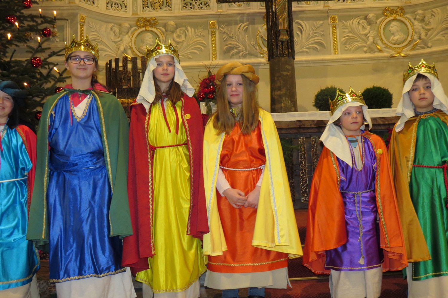 Foto: Gisela AlbrechtDie Mädchen und Jungen in ihren prächtigen Gewändern mit goldfarbenen Kronen und Sternen gaben ein farbenfrohes Bild im Altarraum ab. Bruder Pirmin erklärte zu dem Brauch des Dreikönigssingens: »Die Sternsinger sollen Licht in die Gemeinde bringen, Gottes Segen und gute Wünsche für das kommende Jahr.«