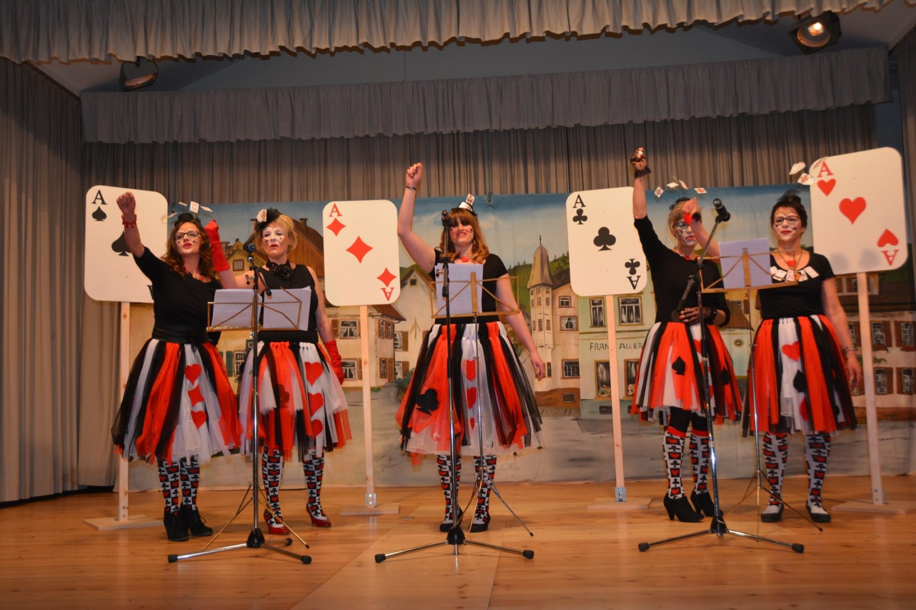 Im Spiel der Dörfle-Frauen waren gleich fünf Asse. Und die stachen. »Ja, wir schaffen das«, vermachten sie dem Bürgermeister vom Städtle, dem »kleinen Donald Trump von Zell« und fragen sich aber: »Wer soll das bezahlen?« »Er verbündet sich mit dem Osten, was wird das wohl kosten?« Peinlich war für die Ass-Damen das Werben um Feriengäste im Internet und im Zeller Wasser vermuteten sie gar zu viel Hormone, weil »die Karten gerade neu gemischt werden«. Fachkräftemangel herrscht auch in der Pfarrei, wo das Sternsinger-Personal jetzt schon über die Zeitung gesucht wird.