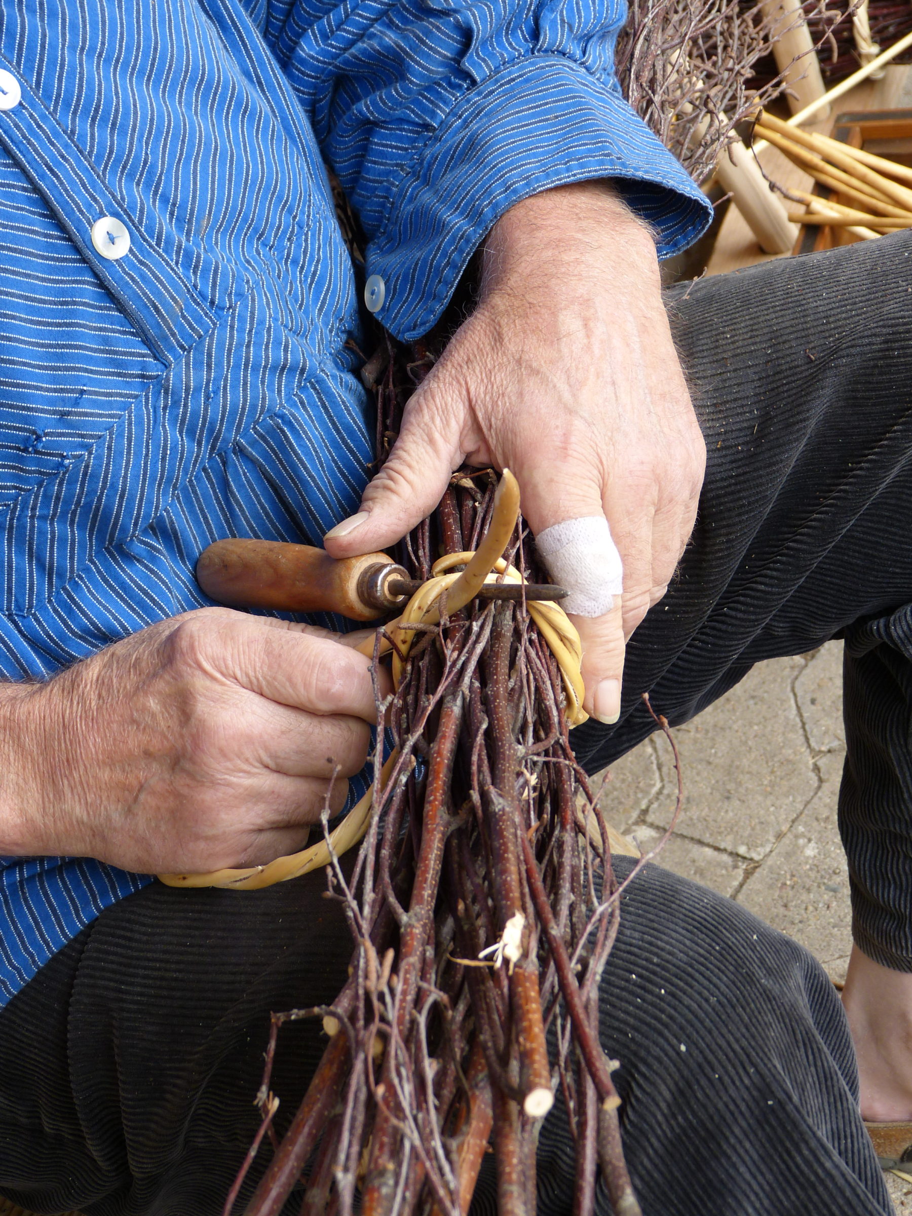 Die gedrehte Weidenrute dient dem Zusammenbinden des Reisigbündels, das er sich aus einem Gewirr von Birkenzweigen zurechtgeschnitten hat und durch das er eine Ahle stößt. Durch die entstandene Lücke »fädelt« er die Rute, legt sie um das Bündel und zieht die Schlaufe mit viel Krafteinsatz fest. Dann führt er die Rute einige weitere Male durch die Schlaufe und schneidet sie ab. »Das hält«, bekräftigt er, zumal sich das Material beim Trocknen zusammenziehen wird: Das erste von insgesamt drei »Bändern« ist fertig.