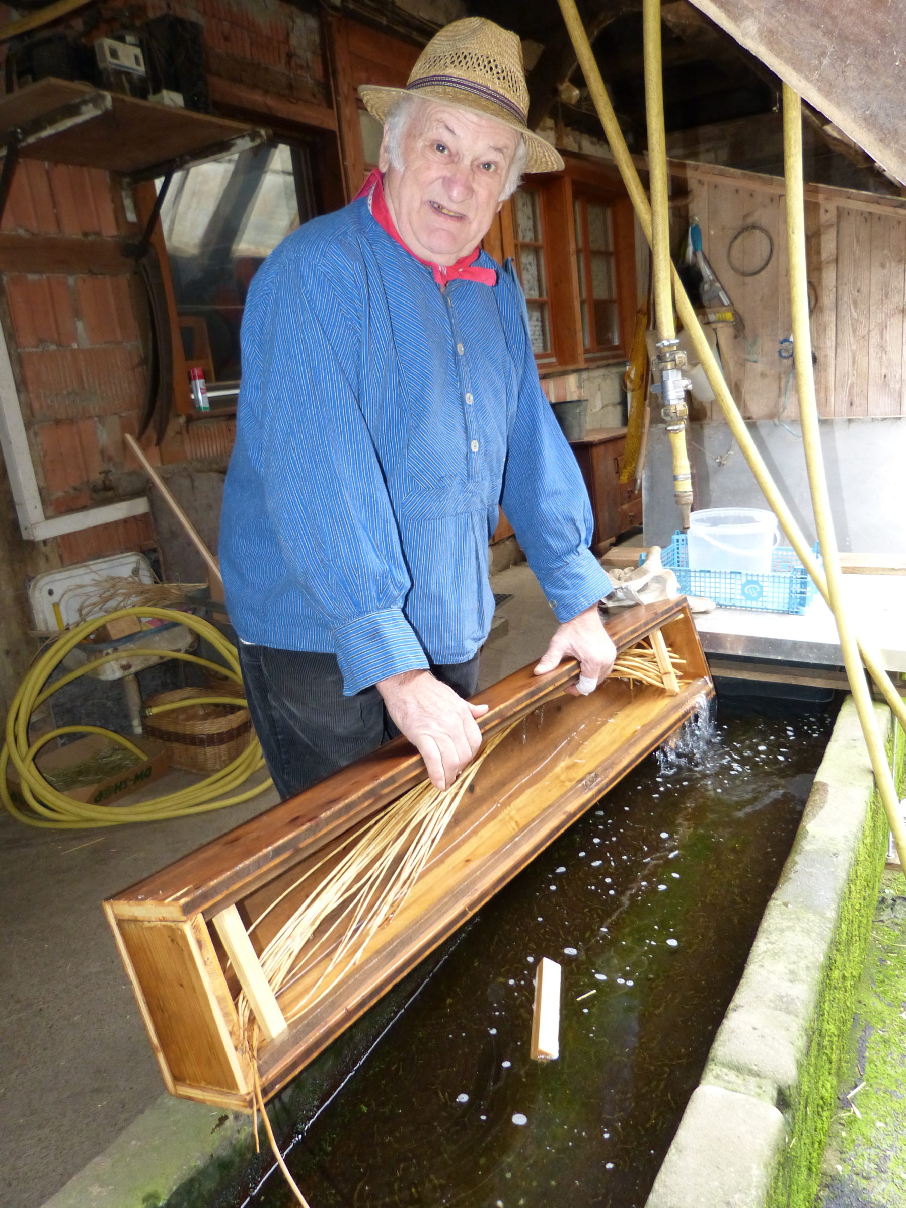 Jetzt soeben holt er bereits geschälte Weidenruten aus dem Brunnentrog hier oben auf dem idyllisch gelegenen Hof, auf dem allenfalls ab und an das Signal des Bähnles aus dem Tal zu hören ist. Dass die Ruten zwei Tage und eine Nacht lang gewässert werden müssen, erklärt Ludwig Schwarz, »wenn sie trocken sind, kann man damit nichts anfangen.« Deswegen hat er auch bei Vorführungen stets einen wassergefüllten Trog dabei, »damit mir das Zeug während dem Schaffen nicht trocken wird.«