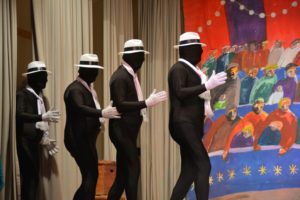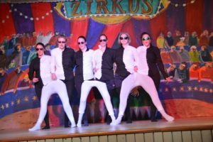 Ebenfalls ganz in Schwarz und Weiß präsentierten sich die schaurigen Harlekins, die mit ihrem gespenstischem Tanz und ihren Fratzen im »Zirkus des Grauens« auftauchten. Der kraftstrotzende Männertanz mündete in große Gefühle: Zum »Flashdance«-Welthit »What a feeling« tänzelten die Jünglinge in aufreizenden schwarzen Bodys und mit kurzen Nylonstrümpfen.