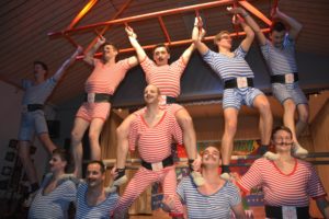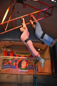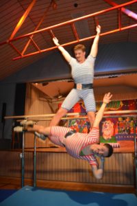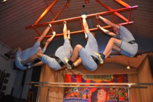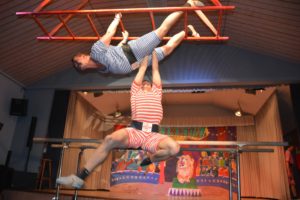 »Schwer« – »stark« – »männlich«: das waren die Attribute für die spektakuläre Luftnummer der Leistungsturner an der schwebenden Leiter. In ihrem gestreiften Turnanzug und mit dicken Bauch passte ihr äußeres Erscheinungsbild so gar nicht zu den Saltos und Schwebefiguren, die sie über den Köpfen des Publikums und direkt unter der Hallendecke präsentieren. Dabei bauten sie sich manches Luftschloss, bildeten Menschenschaukeln und ließen sogar die Glocken läuten. Klamauk und turnerisches Können ergänzten sich zu einer zirkusreifen Show, von der das begeisterte Publikum lautstark eine Zugabe forderte.