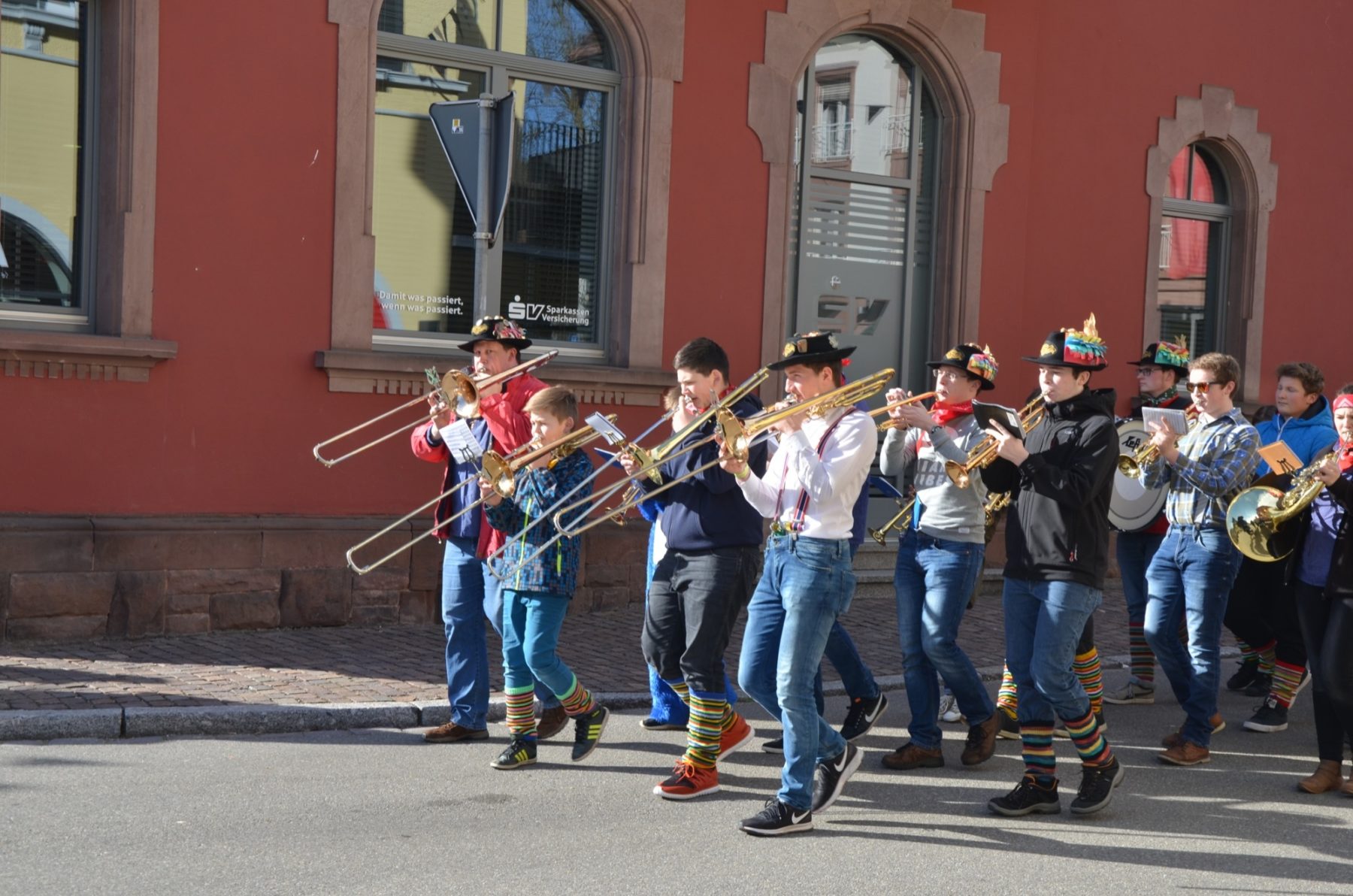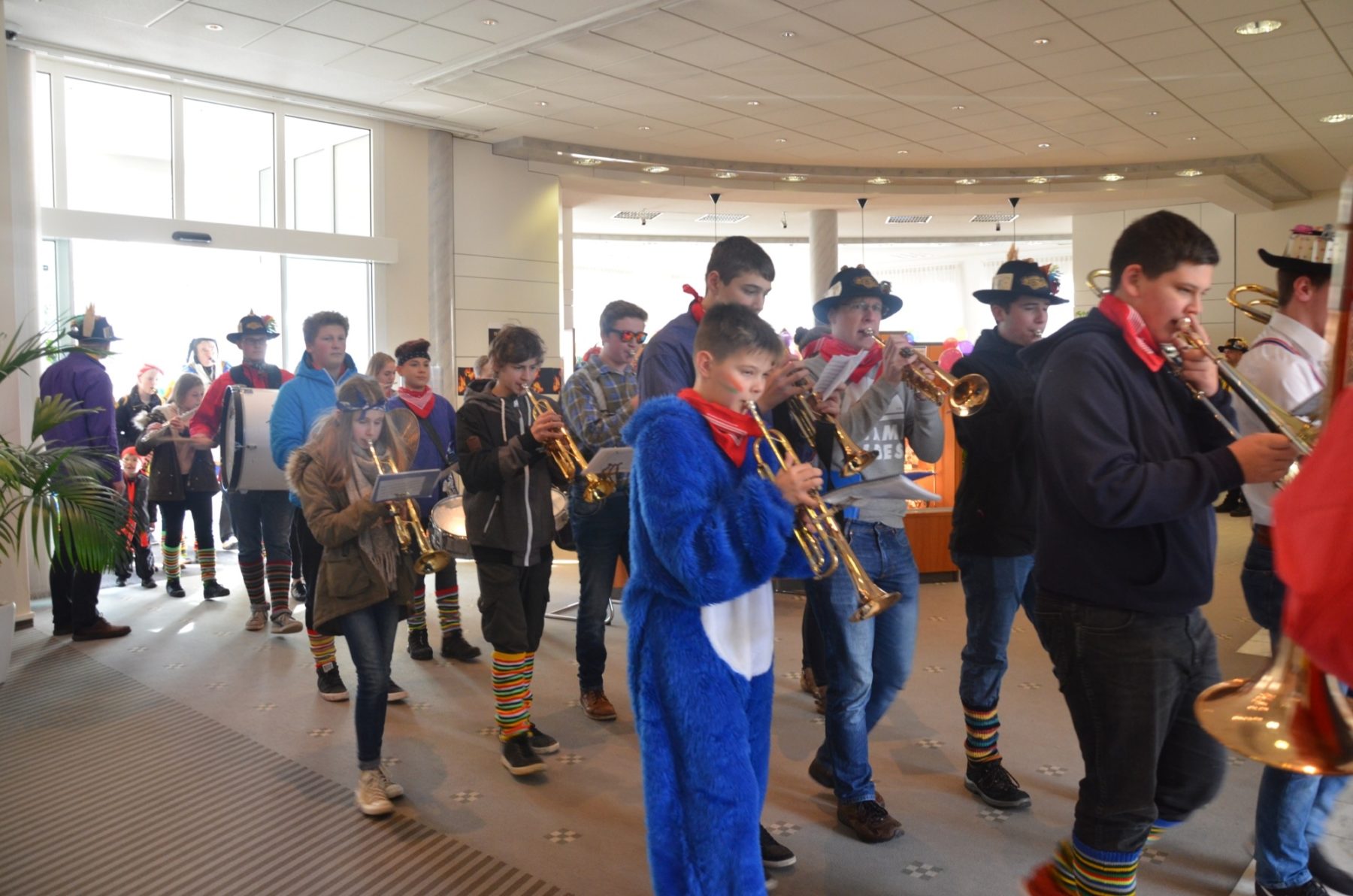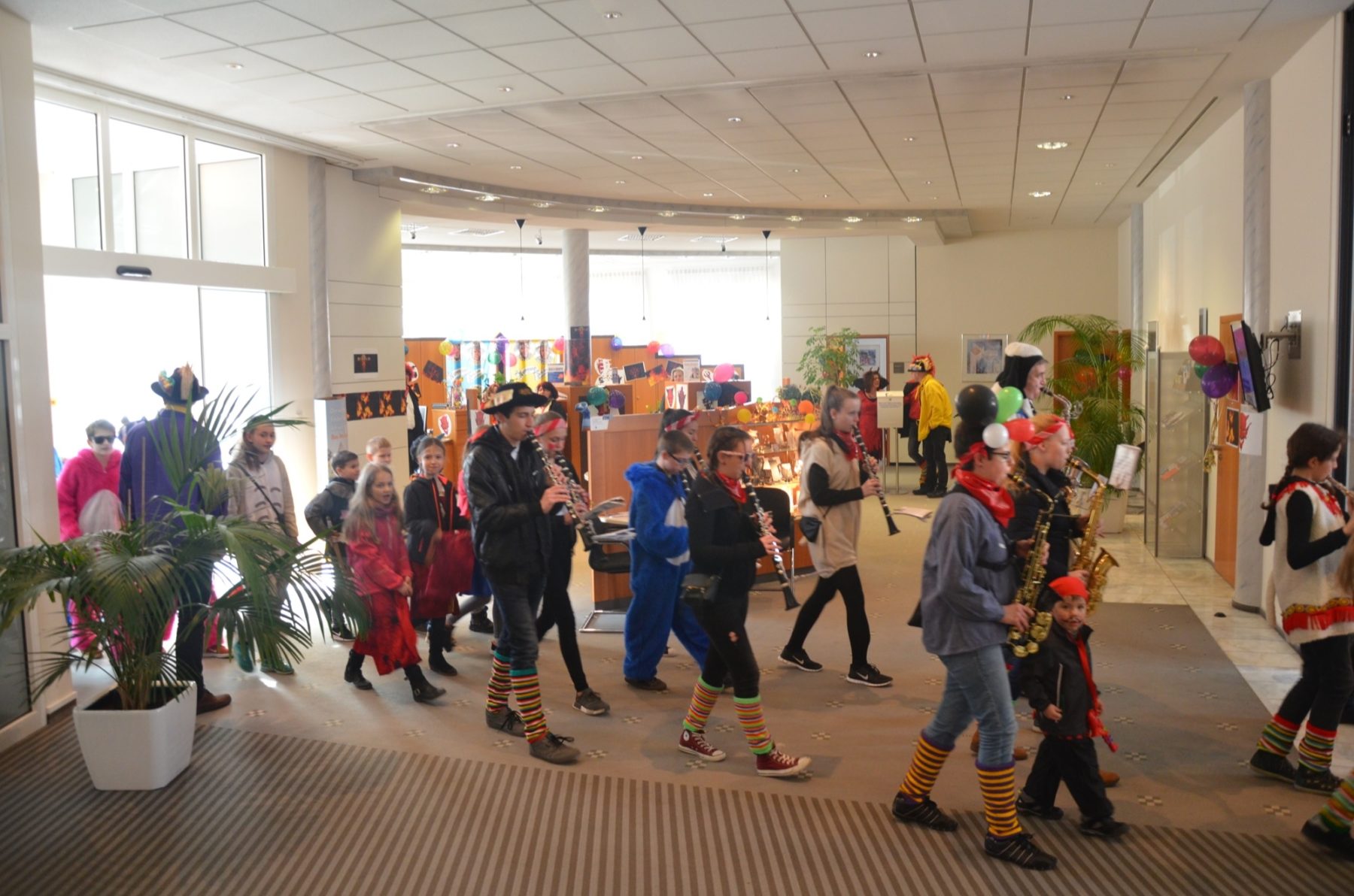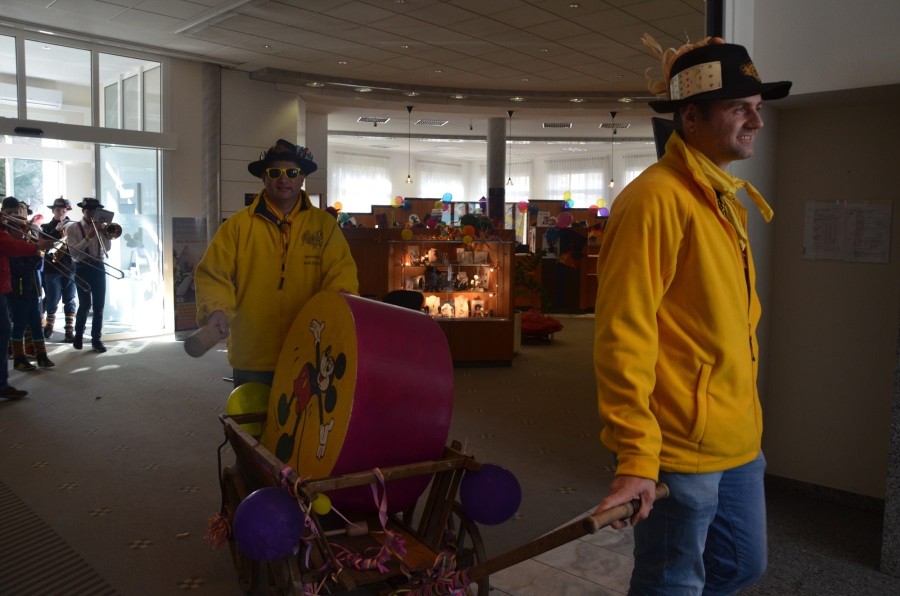 Zum Durchgehen(d) geöffnet sei doch die Volksbank, nahmen die Narrenobersten die Öffnungszeiten wörtlich und Zunftmeister Clemens Halter marschierte zielstrebig auf die Filiale zu. Narrenrat, Kapelle, »Sume« folgten zum einen Eingang hinein und zum anderen wieder hinaus. Die 38 Jungmusiker der Jugendkapelle »ZEH« hatte derweil den Narrenmarsch angestimmt und die Berater der Volksbank stimmten nach erster Verwunderung mit ein.