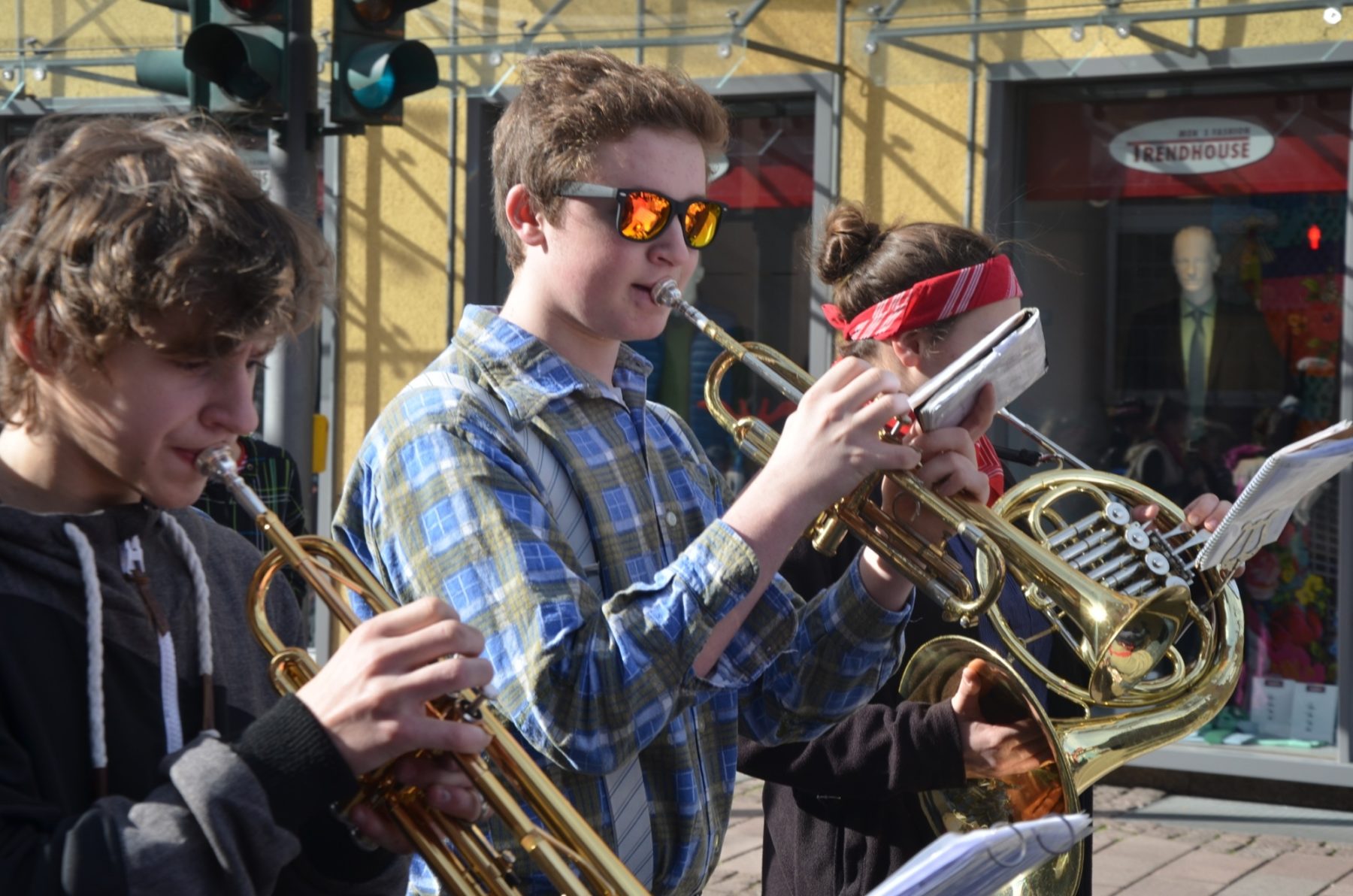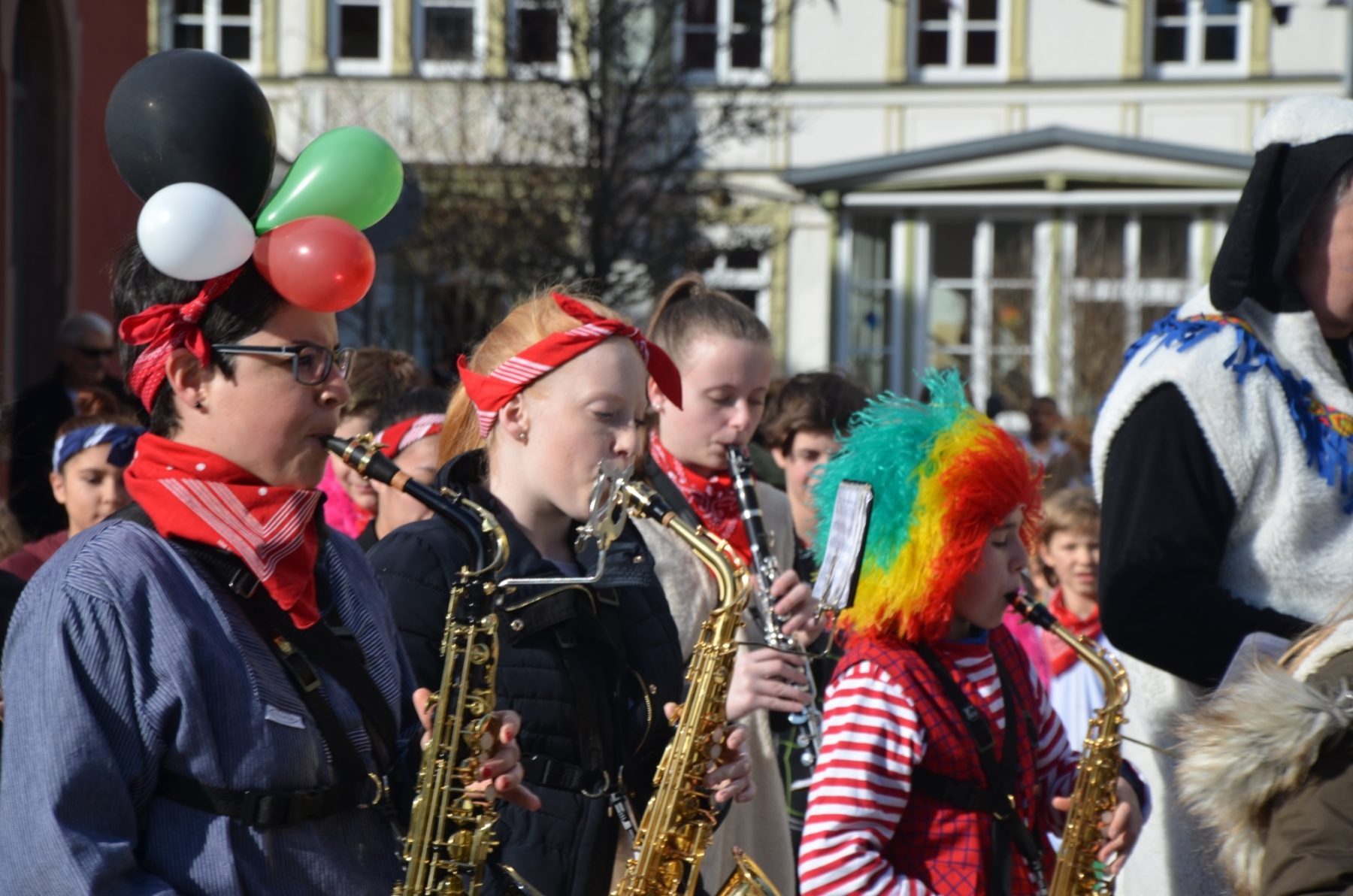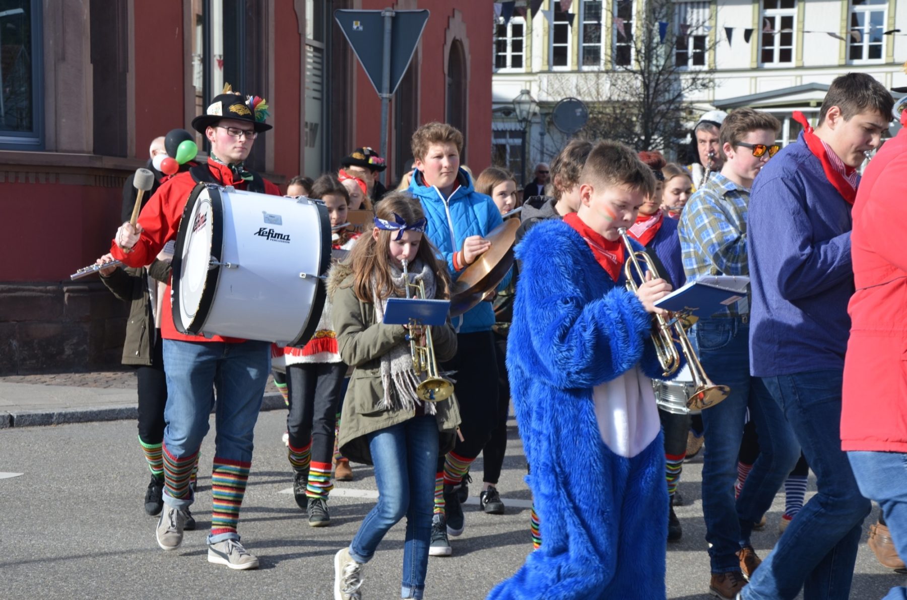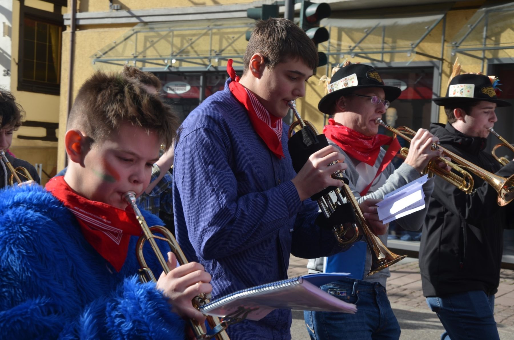 Zum Durchgehen(d) geöffnet sei doch die Volksbank, nahmen die Narrenobersten die Öffnungszeiten wörtlich und Zunftmeister Clemens Halter marschierte zielstrebig auf die Filiale zu. Narrenrat, Kapelle, »Sume« folgten zum einen Eingang hinein und zum anderen wieder hinaus. Die 38 Jungmusiker der Jugendkapelle »ZEH« hatte derweil den Narrenmarsch angestimmt und die Berater der Volksbank stimmten nach erster Verwunderung mit ein.