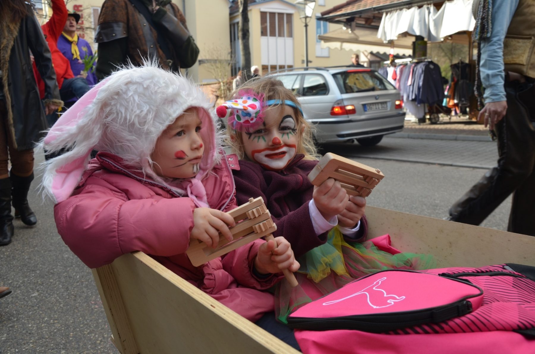 Nicht jedes Kind hatte sich ausstaffiert, aber doch die ein und der andere war ganz stolz, sein krachmachendes Instrument vorzuführen. Holzlamellen glitten über ein Zahnrad und das Rattern der Rätsche rauschte über die Straße. Blecherne Trommelschläge hallten zwischen den Fassaden empor.