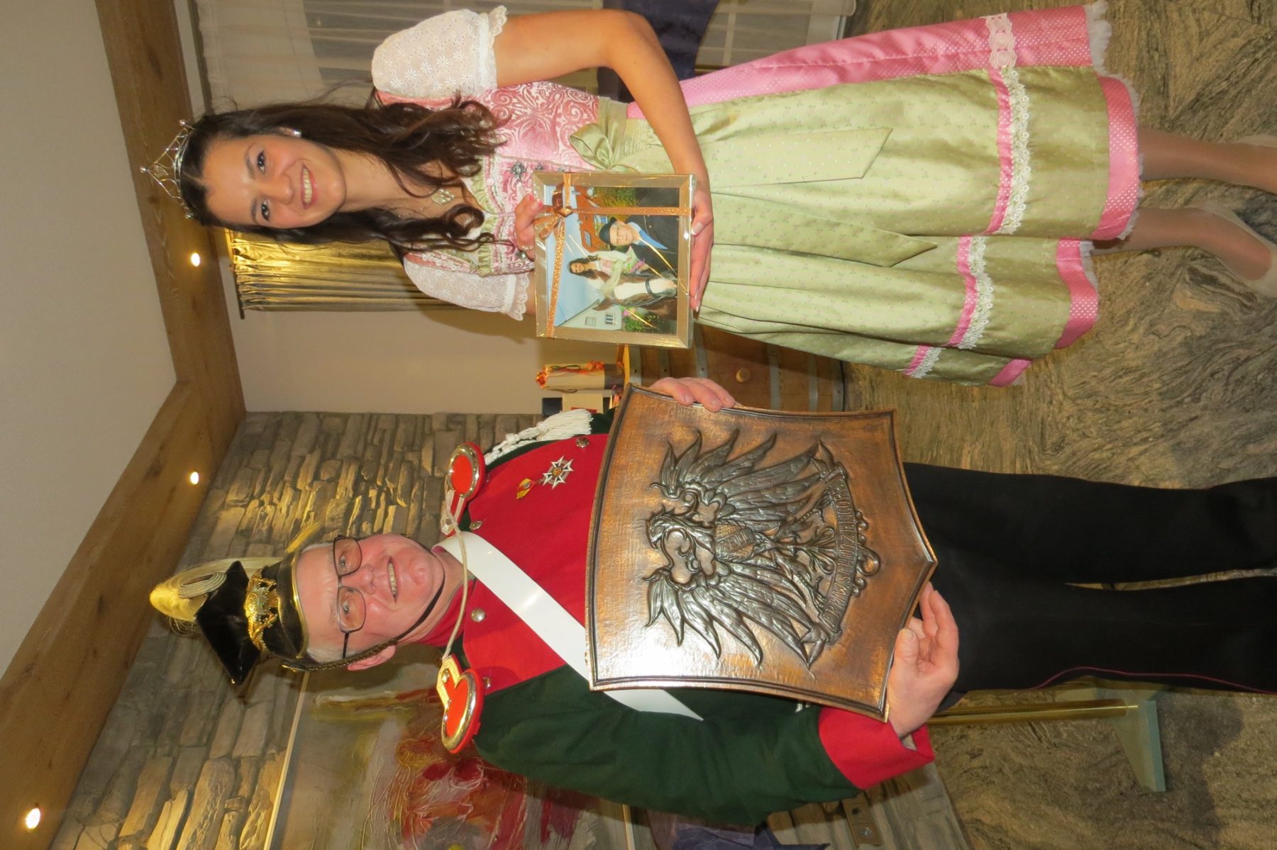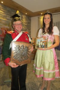 Überraschungsgast Carina Stulz, die Gengenbacher Weinprinzessin, war bereits beim Aufmarsch der Bürgerwehr mitgelaufen. Fridolin Schwendemann führt in jedem Jahr die Kutsche mit den Ehrengästen beim Gengenbacher Weinfest und kennt die Weinprinzessin persönlich. Er freute sich sichtlich über ihren Besuch. Zusammen mit der Königinnenmutter Maria Bruder überreichte sie ein Foto, das sie auf seinem Pferd mit ihm zusammen beim letzten Weinfest zeigt.