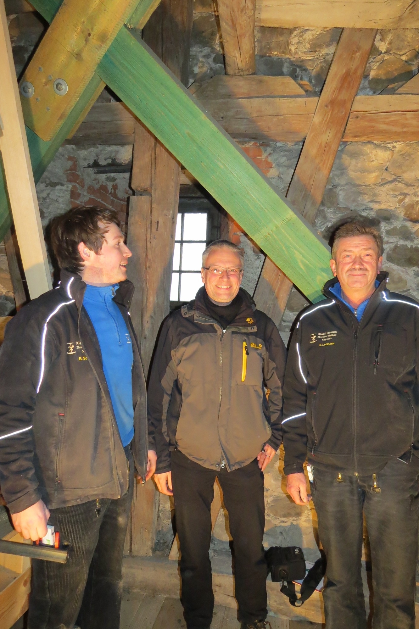 Einen ganzen besonderen Arbeitsplatz haben Arbeiter und Architekt: Im Glockenturm der Pfarrkirche besprechen sie die weiteren Arbeitsschritte. Im Turm ist es räumlich eng, durch die steile Treppen unwegsam und durch die Zugluft sehr kalt – aber es hat auch einen besonderen Reiz. Von links: Benjamin Schätzle von der Fa. Lehmann, Oberharmersbach, Architekt Michael Wieseler und Klaus Lehmann von der Fa. Lehmann, Oberharmersbach.