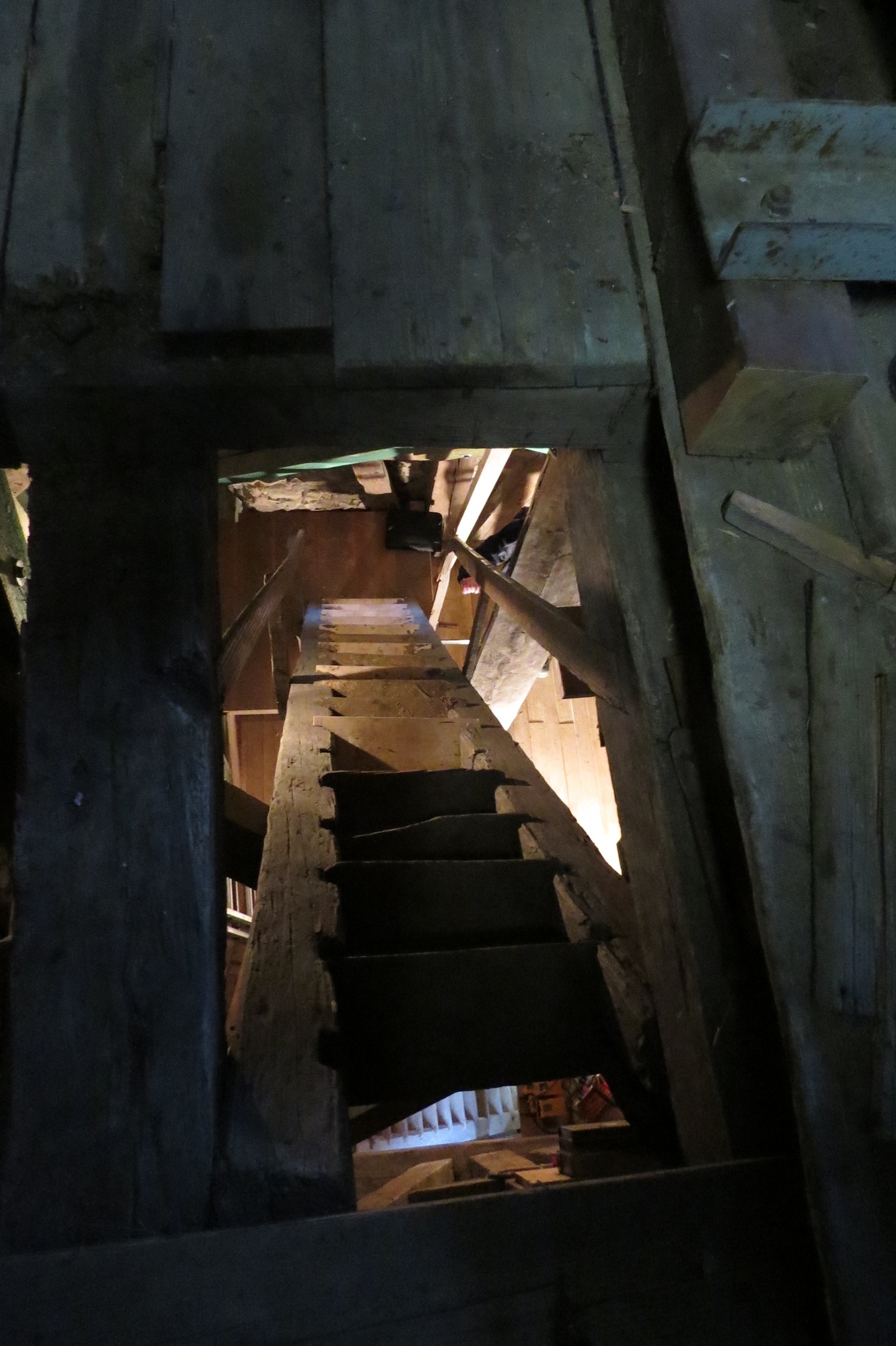 Steile und schmale Treppen verbinden die Ebenen im Glockenstuhl. Die Arbeiter müssen Material und Werkzeug darüber manuell nach oben tragen.