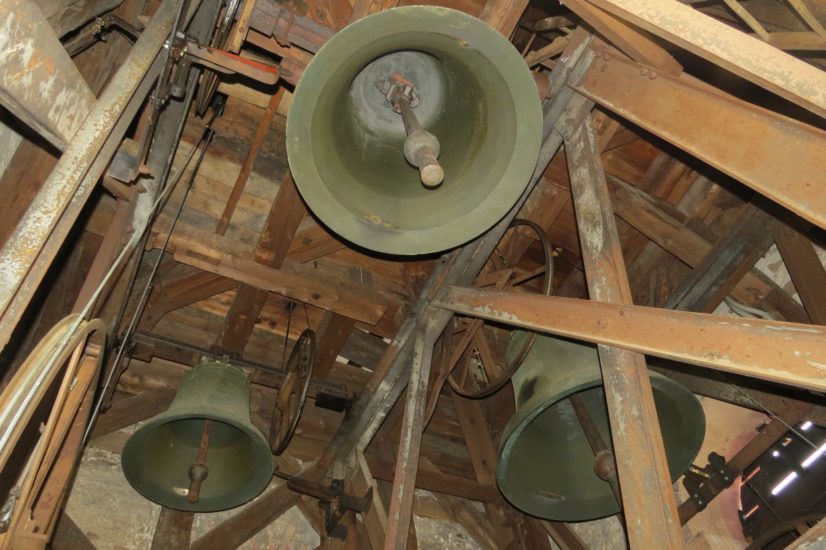 Das Bild zeigt die drei kleineren Glocken unter dem Dach des Turms. Wenn sie läuten, erzeugen sie starke Schwingungen.