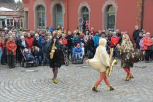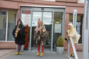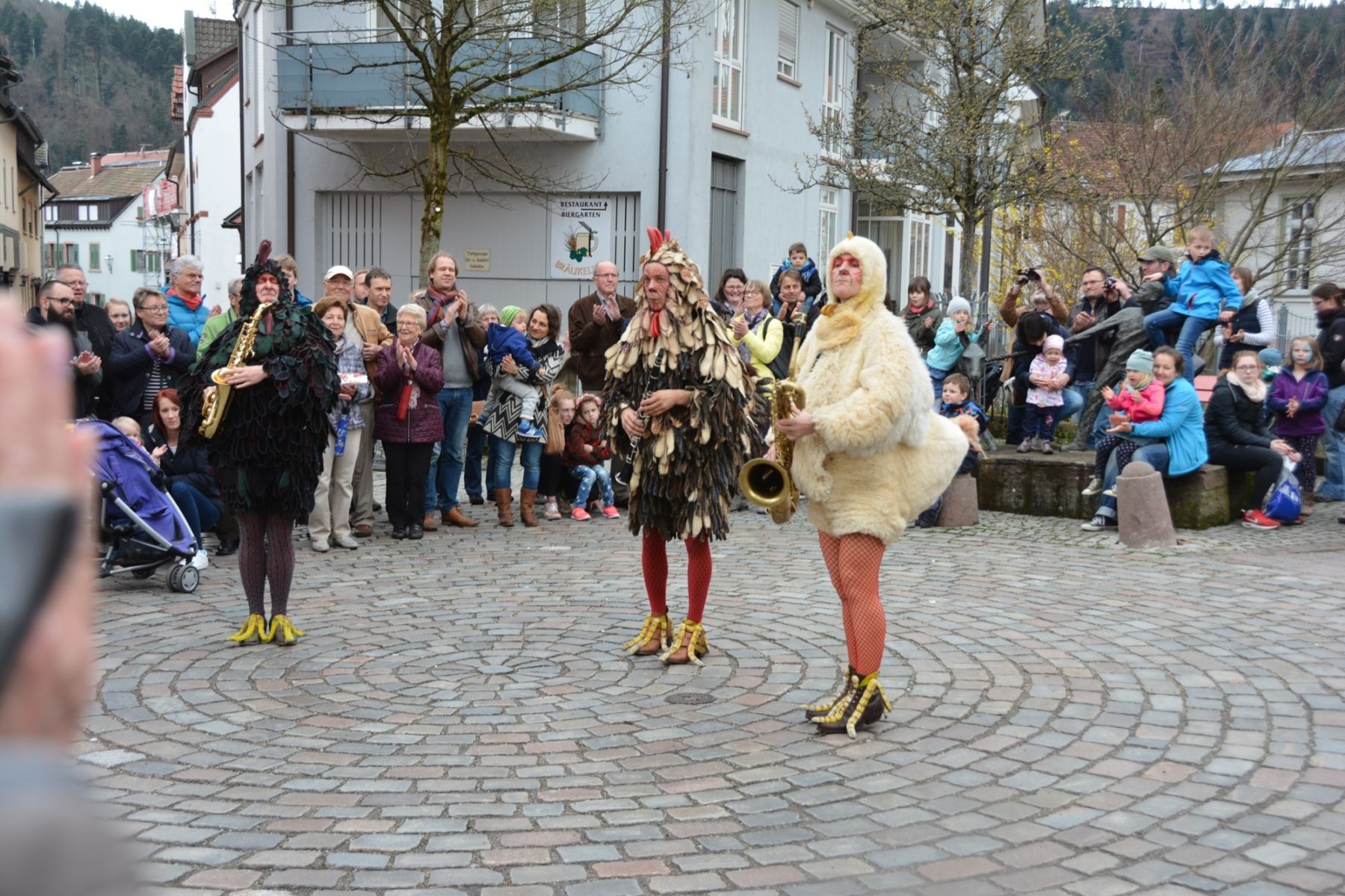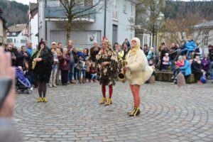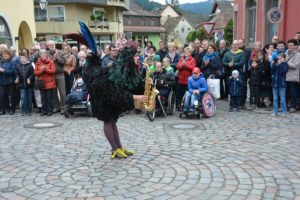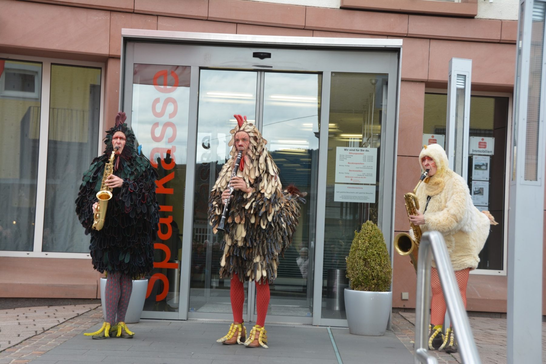Die Stars beim Frühlingsfest waren aber zweifelsfrei die »Cock Tales«. Der prachtvoll gefiederte, musikalische Hühnerhaufen unterhielt das Publikum auf dem Platz vor der Sparkasse mit seinen tierisch-menschlichen Szenen. Der aufgeplusterte Streitgockel und die zickigen Glucken balgten um ein »seltsames« Ei, das wohl eher eine Banane war, und um das begehrte »goldene Ei«. Selbst das Brötchen eines Mädchens, das auf den Schultern ihres Vaters das lustige Schauspiel beobachtet, war beim Auftritt der »Cock Tales« nicht sicher. Das Trio glänzte bei ihrem Spiel sowohl mit ihrer Gestik und auch mit ihrem musikalischen Können. Mit dem Engagement dieser Schauspieltruppe aus Hannover, durch die Stadt Zell im Rahmen des Kulturprogramms »Zellkultur«, hat das Frühlingsfest eine besonders schöne Note erhalten.