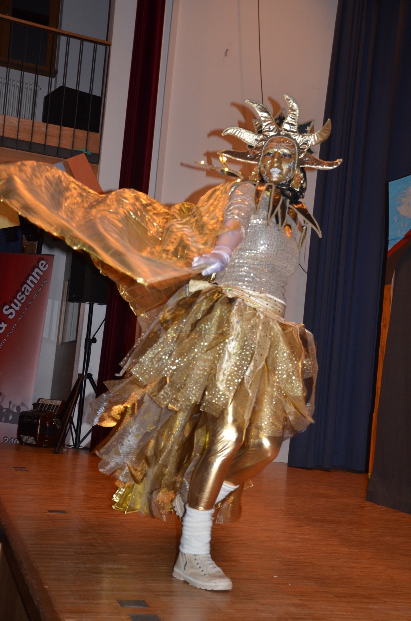Vogelgezwitscher und Frühlingsmelodien kündigten Sonne und trockenes Wetter an und die hübsche Sonnenwächterin Esther Kalmring stellte sich auf der Fasendsbühne vor das Häusle. Ihr Kostüm aus purem Sonnenschein: auf dem Kopf eine goldene Krone, im Gesicht ein schimmernder Teint, 1000 Pailletten glitzerten vom Oberteil und aus Sonnenstrahlen hatte sie ihren Ballerina Rock gemacht. Goldene Chucks sorgten für ein bisschen Bodenständigkeit.
