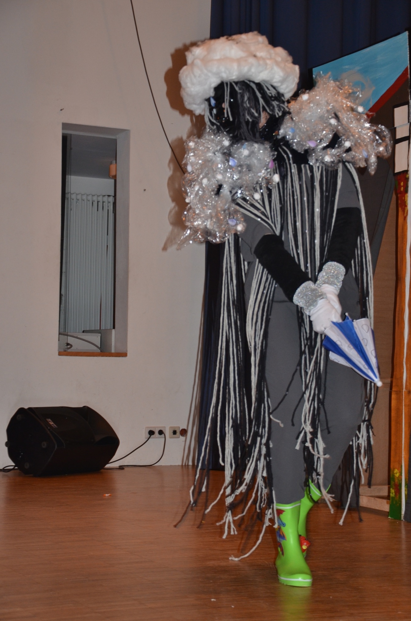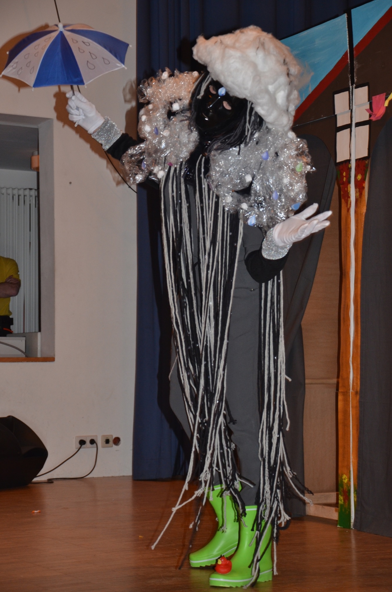 Bei Niederschlag und Feuchtigkeit stellte sich Regenwächterin Pia Spicker vor das Wetterhäusle, um unter dem »Konfetti des Himmels« singen und tanzen zu können. Die Fäden des Regens hat sie zum langen blauen Kleid verbunden, ihr Haare waren gelegt wie weiße Schäfchenwolken, auf den Schultern glitzerte der Nebel und an den Füßen ein Farbtupfer: quietsch-grüne Gummistiefel.