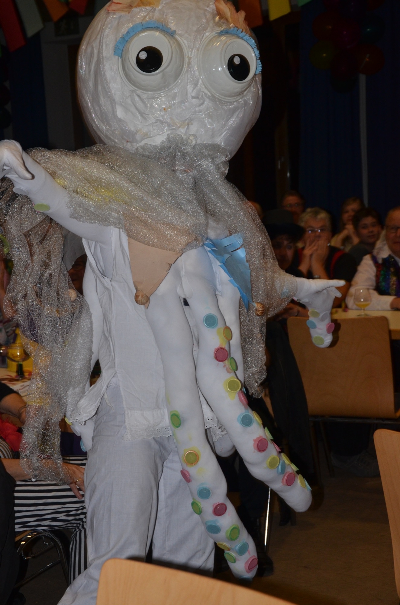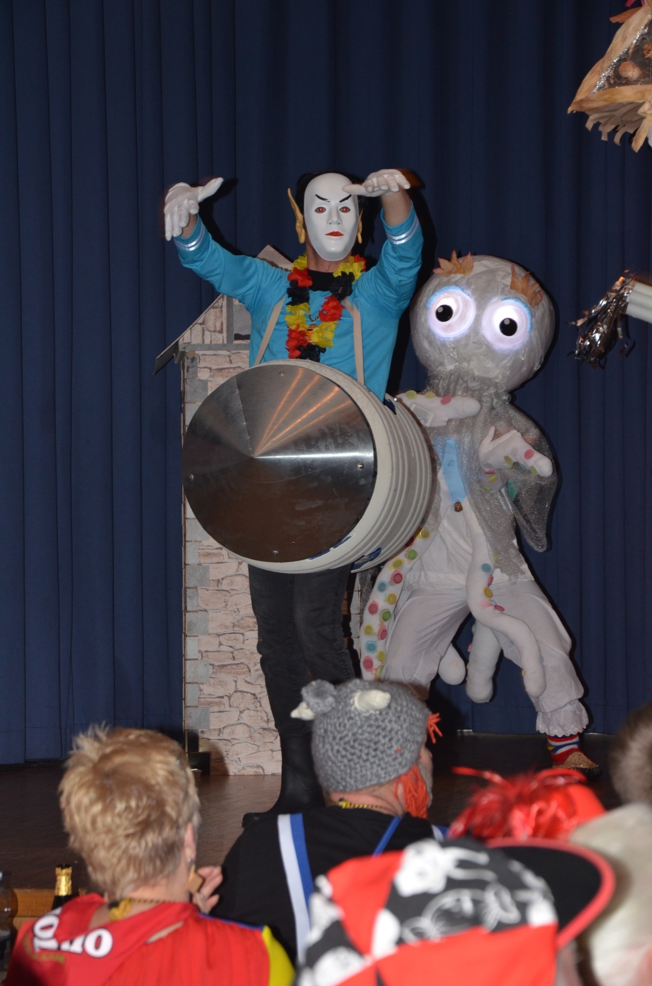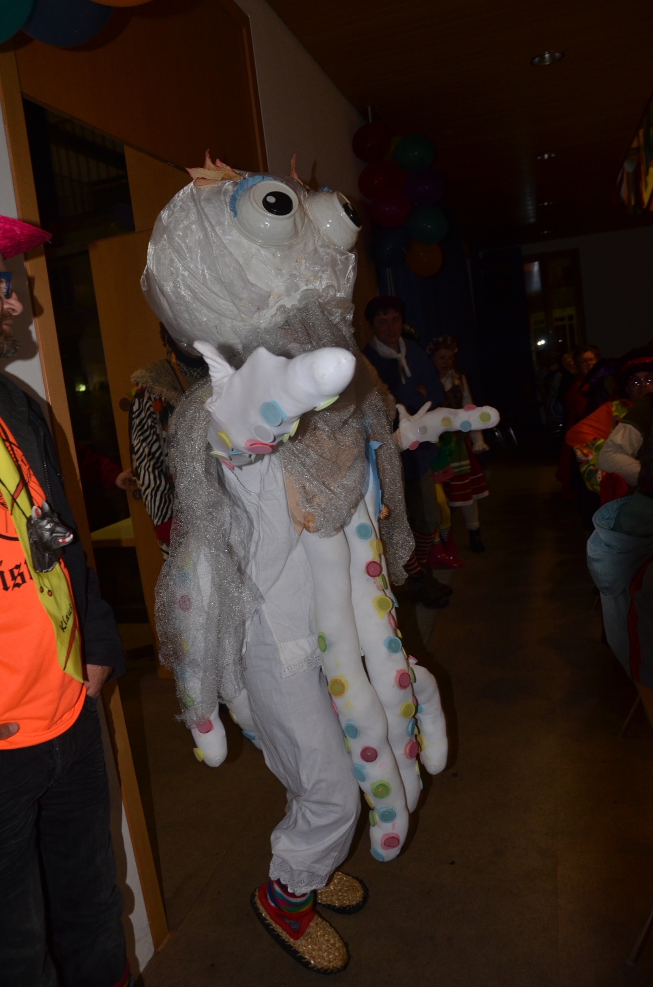 Die Erzählerstimme sprang an den Anfang aller Dinge, als »Gott die Fasend schuf«. Künstler Lugi, von Gott beauftragt, stieg im seiden-grauen Sakko mit weißer Mozartperücke und silberner Krone auf die Bühne und begann sein erstes Werk: Eine Krake mit großem Kopf, weißen Fangarmen und bunten Noppen. Das lustige Tierchen, dessen Augen nur für den Storchenturm leuchteten, kuschelte sich an das Zeller Wahrzeichen – was für ein Bild!
