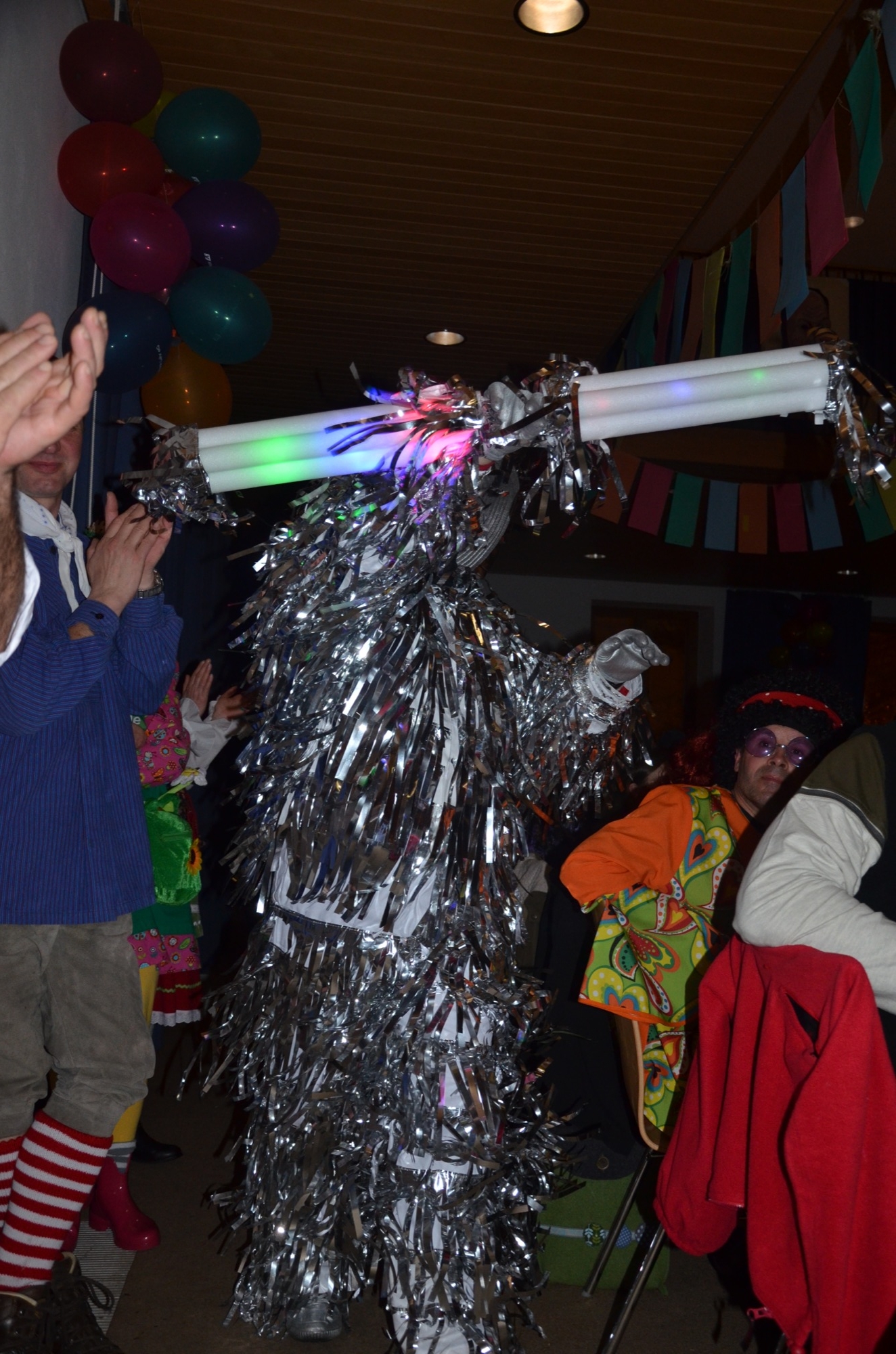 Luigis zweites Werk: Ein Silberstreif am Horizont oder vielleicht das Narro der Zukunft? Breite, silberne Folienstreifen haben die Kostümbildner zu Tausenden um den Narro geschlungen. Die Silber-Bändele flogen und wippten bei jedem Sprung wie Zotteln, dazu leuchtete das übergroße Knicklicht wie eine bunte Disco-Kugel.