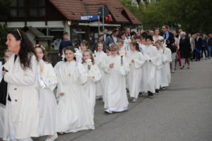Im Kreis standen die Kinder dann um den Altar und beteten gemeinsam das »Vater unser«. Nun war der große Moment gekommen – die Kinder empfingen ihre Erste Kommunion und standen ganz ruhig und andächtig vor Pfarrer Gerner, der ihnen das heilige Brot überreichte. Ein einmaliger, besinnlicher und eindrücklicher Moment, welcher den Kindern und allen Angehörigen bestimmt lange in Erinnerung bleibt.