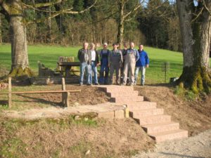 Die alten Stufen waren kaputt und mussten nach 37 Jahren ersetzt werden. Verzögert wurde das Projekt durch eine abgestorbene Pappel, die zuvor entfernt werden musste. Den fleißigen Helfern zum Dank wurde der arbeitsreiche Tag mit einem zünftigen Vesper abgeschlossen.