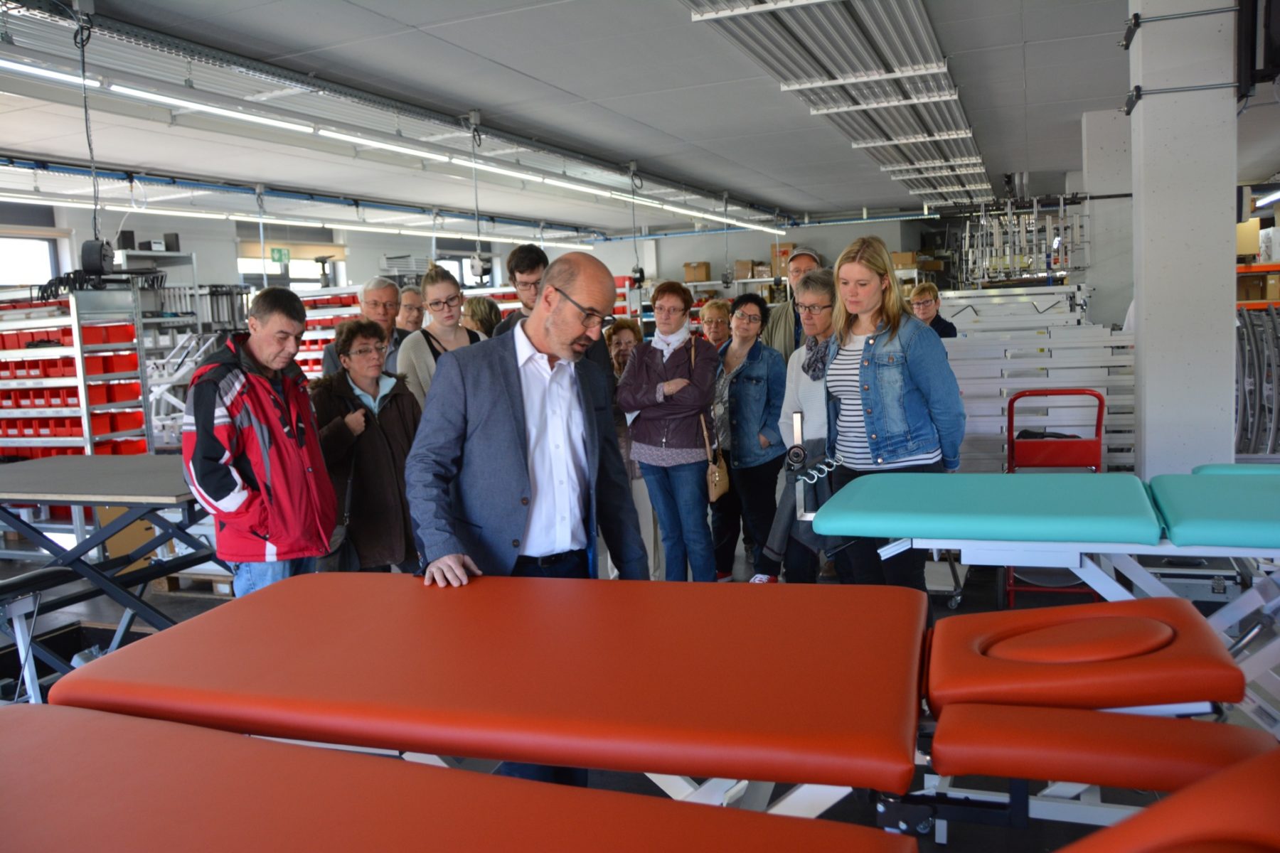 Großes Interesse am »Tag der offenen Tür«: Klaus Gissler (Mitte) konnte viele Besucher durch die modernen Produktionsräume führen und ihnen die verschiedenen Arbeitsschritte bei der Herstellung der Therapieliegen erläutern.