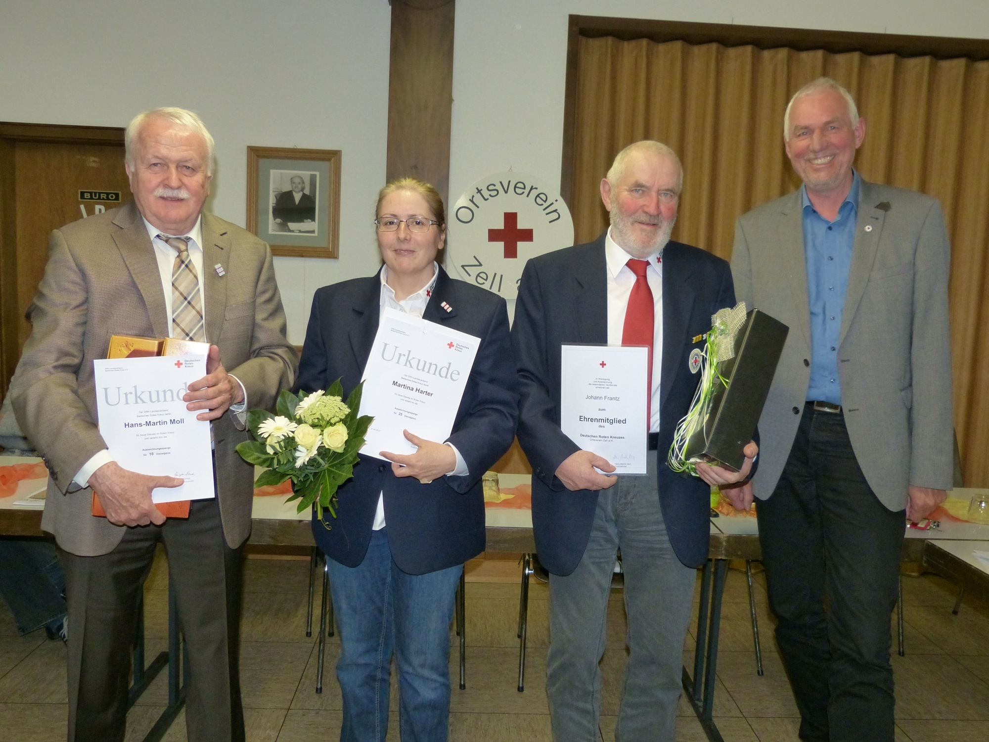 Wobei der im Jahre 2006 dem Verein beigetretene Vorsitzende bedauerte, die Leistung von Johann Frantz nur unzureichend beschreiben zu können, da die für diesen Abend vorgesehene Laudatorin aufgrund einer Erkrankung ihres Mannes kurzfristig verhindert war. Neben Maria Kornmayer und Wolfgang Joos ist Johann Frantz nun das dritte Ehrenmitglied im Zeller DRK. Mit dem Überreichen einer Urkunde bedankte sich Moll ganz herzlich für dessen Leistung im Verein.