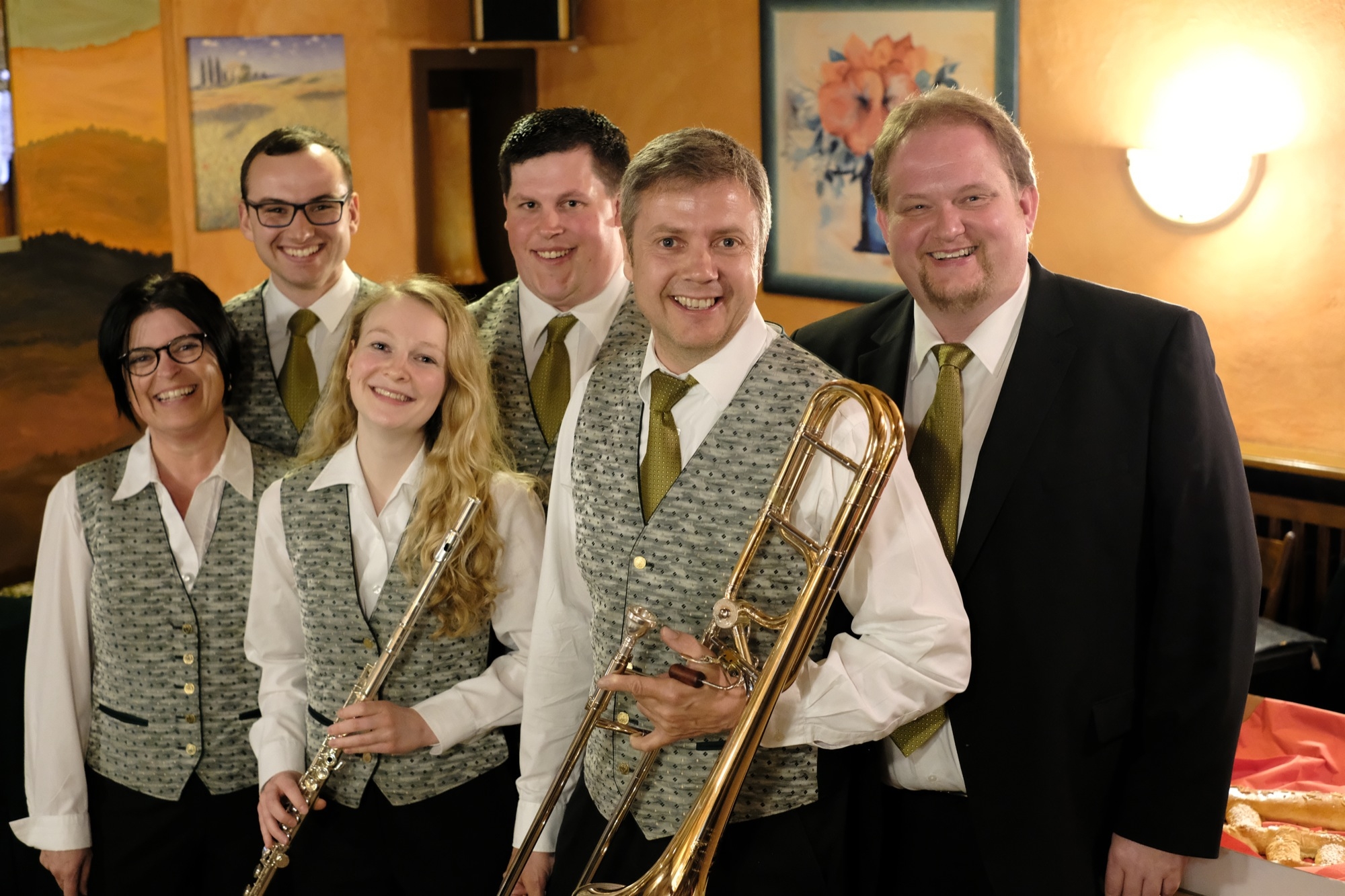 Sage und schreibe 40 Jahren musiziert Markus Selinger (Posaune, vorne rechts) schon mit der Stadtkapelle. Sebastian Grillich dankte ihm dafür, dass er immer zur Stelle sei, wenn man ihn braucht. Er sei »der Mann fürs Elektrische« bei den Konzerten und Sommerevents. Von 1989 bis 1997 war Markus Selinger Beisitzer in der Vorstandschaft, im Jahr darauf zweiter Vorstand der Stadtkapelle. Als Dankeschön und Zeichen der Verbundenheit durfte er sich über einen Kulturgutschein für Veranstaltungen in Offenburg freuen und bekam sein Instrument, die Posaune, in Teigform überreicht. Der neue Dirigent Stefan Polap (rechts) überreichte die Nadel des Blasmusikverbands, dessen Vize Jürgen Isenmann sich krankheitsbedingt entschuldigen ließ.
