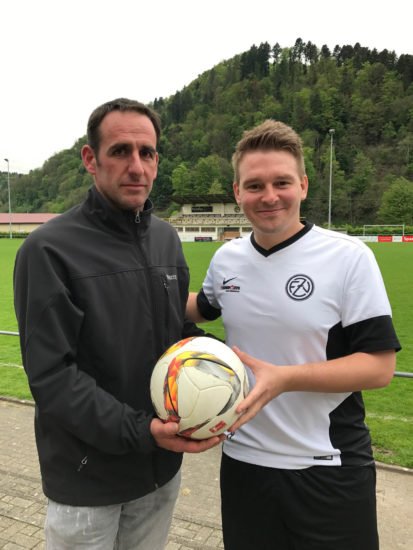 Die Firma Gustav Burger Forstbaumschulen, Inhaber Thomas Burger (links), spendete den Spielball für das Derby des Zeller Fußballvereins am Sonntag gegen den SV Haslach.