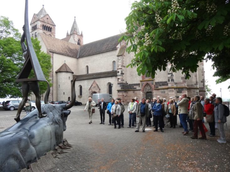 Das Heute wusste der Stadtführer von Breisach Hans-Jochen Voigt faktenreich und bodenständig den 41 Teilnehmern aus Zell zu erzählen. Es sei charakterisiert durch überwiegend harmonisches, nachbarschaftliches Miteinander über die Rheinbrücke hinweg – im gemeinsamen Europa. Und auf dem Weg durch die Altstadt von Breisach konnte er dies in vielen Einzelbeispielen veranschaulichen und berichten. Anstelle der geschliffenen Burg am Ende der Oberstadt steht heute das Freilichttheater der Breisacher Festspiele. Hier wurde gerade gezimmert und gebaut an den Kulissen für die anstehende Spielsaison mit Shakespeares »Was Ihr wollt«. Kultur scheint sowieso ein wichtiges Bindeglied zu sein vor Ort beidseits des Rheins, mit Öffnung zu moderner Kunst (Europa-Skulptur auf dem Münsterplatz) und der Bewahrung der Kunst des Oberrheins (Marienaltar des Meisters HL im Breisacher Münster).