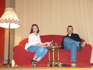 Zwischen weiteren Leseparts lud Nicole Bischler den Autor immer wieder ein, auf einem auf der Bühne aufgestellten roten Sofa Platz zu nehmen. Denn hier betätigte sich die lese- und bücherbegeisterte Physiotherapeutin, die den Lesungsabend organisiert hatte, als versierte Interviewerin.