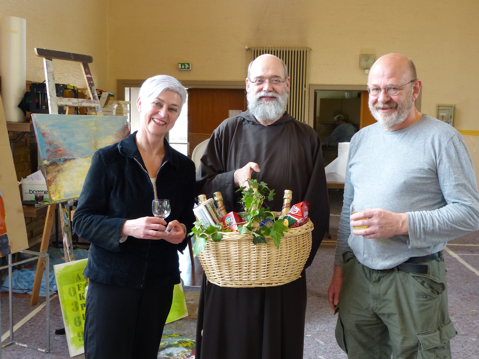 Vor allem auch beim Haus bedankte sie sich, insbesondere bei dessen neuem Leiter Bruder Markus. Mit einem Präsentkorb beglückwünschte der zum Jubiläum und gestand: »Es ist ja das erste Mal, dass ich so was erlebe und ich habe mir im Vorfeld gedacht: Was das wohl gibt?«, sorgte er schmunzelnd für Gelächter, »aber es hat mir gut gefallen. Ich fand es sehr spannend, hier immer wieder reinzulinsen und zu gucken: Was wird denn da gekünstlert?«