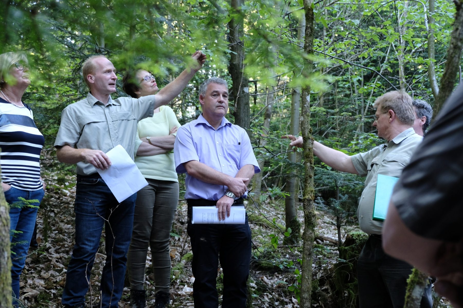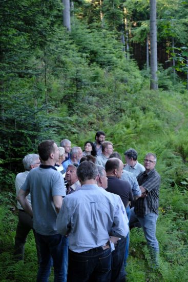 Einige Meter weiter konnten die Teilnehmer der Exkursion in Augenschein nehmen, wie die Naturverjüngung nach einem Sturmschaden funktioniert. Es hatten sich dichte Bestände von jungen Bäumen unter dem Altbestand gebildet. Ein großer Vorteil des derart nachwachsenden Waldes sei, so die Forstexperten, dass die einzelnen Bäume aufgrund der diffusen Lichtverhältnisse trotz gleichen Alters unterschiedlich schnell heranwachsen und man so einzelne Bäume aus dem Bestand ernten kann. Eine Verjüngung freizustellen sei nicht gut, denn dann würde die Konkurrenzsituation befeuert. Die Hiebreife, so lernten die Anwesenden außerdem, hängt nicht am Alter, sondern am Durchmesser. Über 50 Zentimeter starkes Holz solle bewusst genutzt werden, um es nicht überdick werden zu lassen.