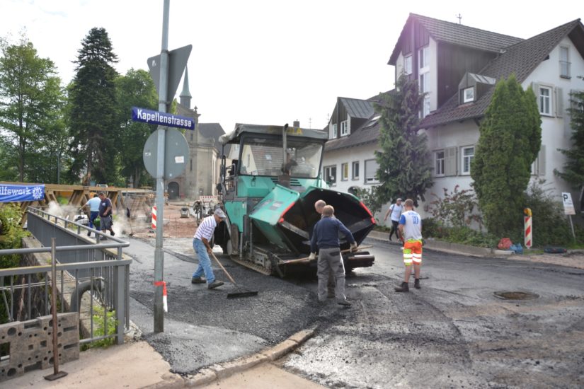 Am heutigen Dienstag wurde in der Kapellenstraße mit den Asphaltarbeiten begonnen. Auch der Straßenanschluss zur Behelfsbrücke wird fertiggestellt. Zwei Tage sind für die Asphaltarbeiten vorgesehen.