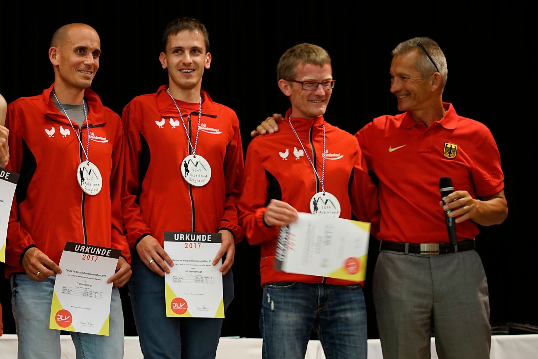 Bei idealem Laufwetter machten sich die 243 DM-Teilnehmer auf die abwechslungsreiche Strecke hinauf zum Großen Arber. Schnellster der LG war Bruno Schumi, der als Achter in 1:01:43 seine Platzierung aus dem Vorjahr wiederholen konnte. Ebenfalls unter die Top Ten kam als Zehnter Timo Zeiler in 1:02:36 Std. Ulrich Benz als 18. im Gesamtfeld in 1:04:07 war der 3. Mann im Männerteam, das mit dieser ausgeglichenen Leistung auf einen guten zweiten Platz der 35 angetretenen Männermannschaften kam und sich über die Silbermedaille freuen durfte. Hans Roth erreichte bei seiner ersten DM Teilnahme in 1:10:10 als 48. das Ziel. Lothar Killig hatte leider keinen optimalen Tag erwischt und erreichte in 1:26:35 als 127. das Ziel.