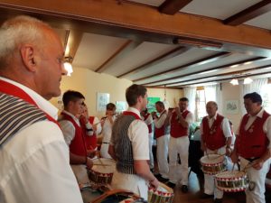Nicht nur die Bürgerwehr, sondern die gesamte Ortschaft sei stolz auf die Jubilare, die über lange Jahrzehnte den Ort in so hervorragender Weise repräsentiert hätten. Gerade in der heutigen, schnelllebigen Zeit seien sie echte Vorbilder und Botschafter für das Ehrenamt. Der Ortsvorsteher würdigte zudem die Verdienste der beiden Jubilare in weiteren Bereichen der Ortschaft. So habe Werner Kuderer die alte Trotte am Fürstenberger Hof und die dazu gehörende Apfelzerkleinerungsmaschine zum Mostmachen ehrenamtlich in vielen Stunden repariert und bei Heimatfesten selbst getrottet und ausgeschenkt. Der Ortsvorsteher: »Sein Most war und ist der Beste.« Ludwig Schwarz war ebenfalls bei vielen Heimatfesten und Heimatabenden aktiv und hat die alte Kunst des Besenbindens vorgeführt. Der Ortsvorsteher: »Seine Besen fegen am besten und ein Schwätzle mit ihm war für viele Gäste ein unvergessliches Erlebnis.«